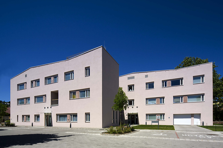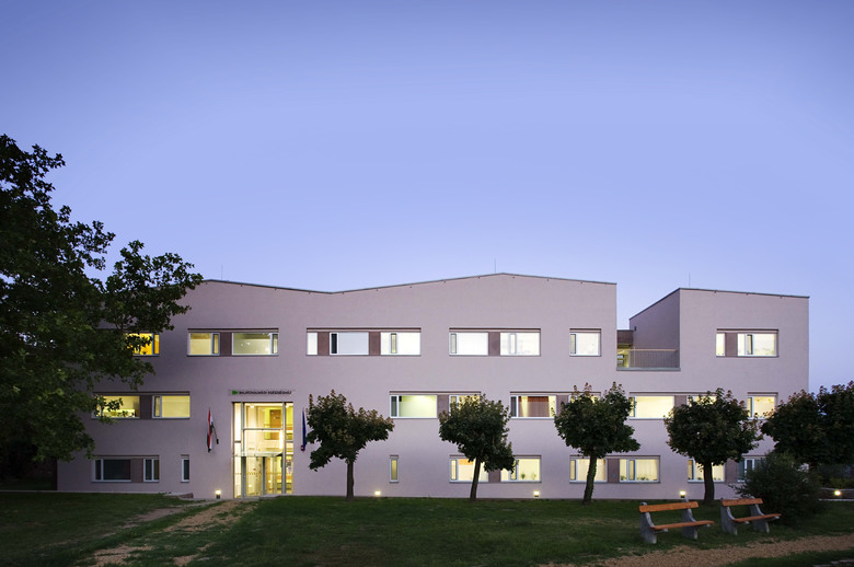 The health centre is located a couple of hundred meters from the city center in Balatonalmádi by the foot of the mountain. The building is situated between a major park at the end of the Petőfi Sándor street and some modern style apartment buildings that characterizes the street. The building appears as a harmonious seal to the row of the street line. The house follows the striped form of the building line of the street and at the same time its public space structure connects the spacious green area of the park. The small scaled landscape and architectural elements eliminate the building from its surroundings; the delimited architectural joint creates a delicate transition between the different functions. This placement assures the opportunity of an extension if it is needed in the future.