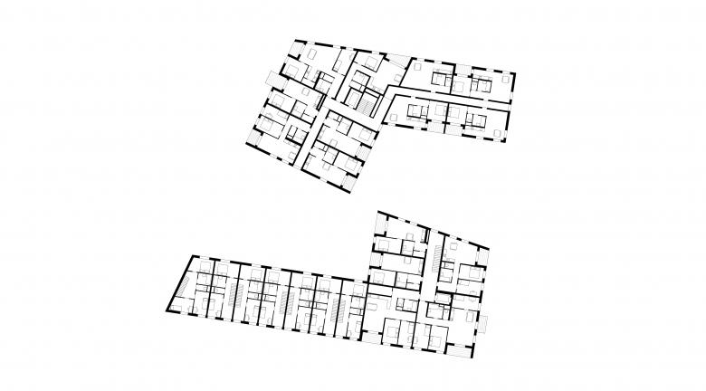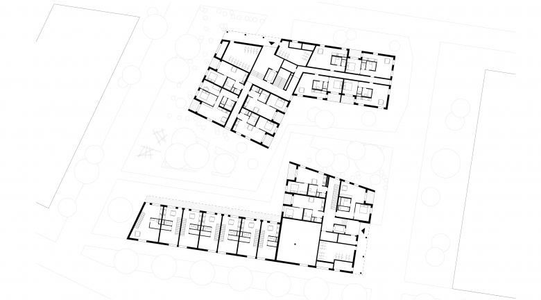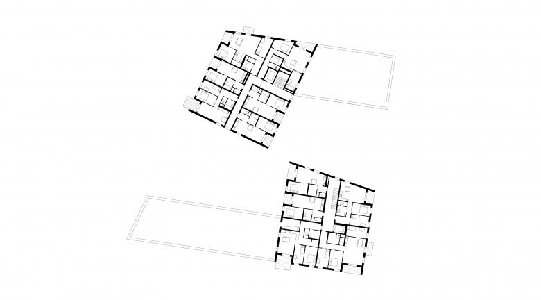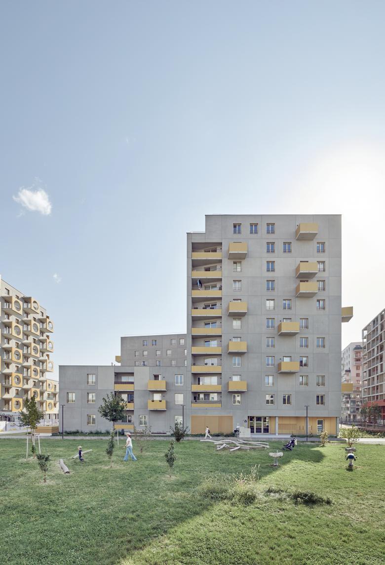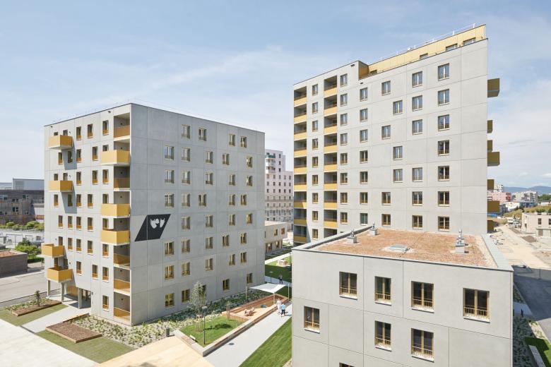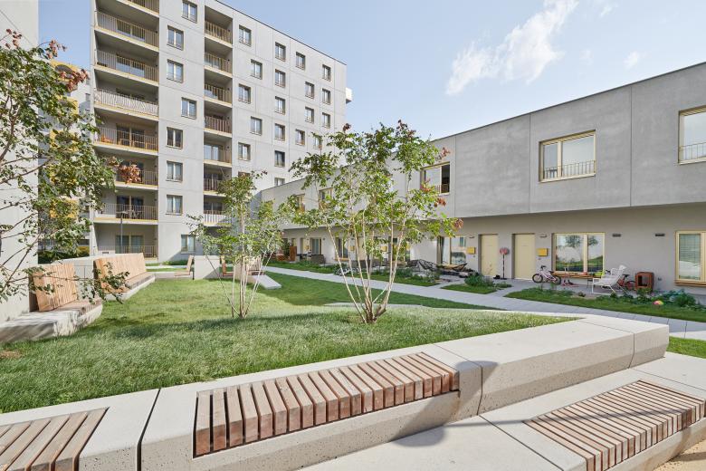 Den Bauträgerwettbewerb haben wir gemeinsam mit g.o.y.a. gewonnen, unsere Wohnbauten setzten wir jeweils eigenständig um. Direkt gegenüber des Bildungscampus Berresgasse, einem wichtigen öffentlichen Knotenpunkt für das neue Viertel, haben wir zwei geförderte Wohnbauten mit 113 Wohnungen und sieben Reihenhäusern realisiert. An die Gebäude mit elf bzw. acht Geschoßen schließt jeweils ein flacher, zwei- bzw. dreigeschoßiger Bauteil an. Zusammen bilden die Baukörper ein offenes Ensemble mit zwei begrünten Höfen.