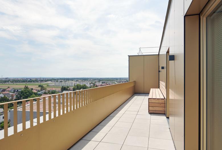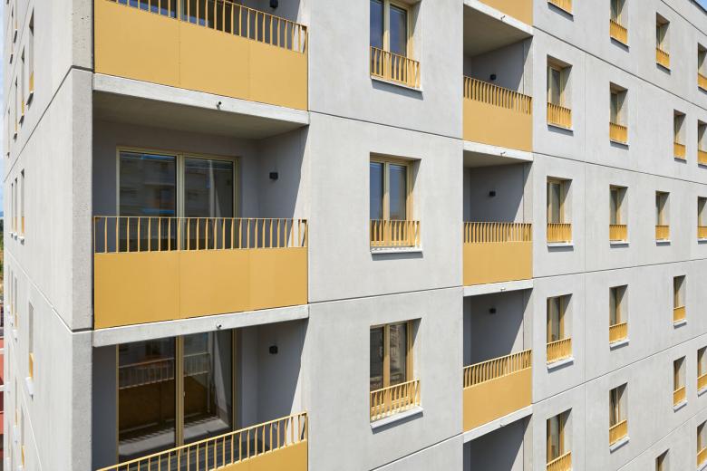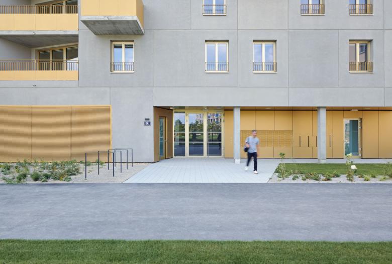 Die Vorfertigung im Werk ermöglicht eine hohe Präzision und Qualität bei der Verarbeitung des Betons. Die im Gegensatz zu einer herkömmlichen Bauweise in Ortbeton und Vollwärmeschutz etwas höheren Elementkosten können mit der Verkürzung der Bauzeit kompensiert werden. Die Außenhülle ist nach dem Versetzen auf der Baustelle fix fertig, nur die Fenster müssen noch in die dafür vorbereiteten Öffnungen gesetzt werden. Für eine hochwertige Oberflächenstruktur sind die Bauteile sandgestrahlt. Die goldfarbenen Balkongeländer und Fenster fügen sich elegant in die Sichtbetonfassade ein. Diese ist extrem robust und damit sehr langlebig. In dieser Form kann auch Beton nachhaltig sein.