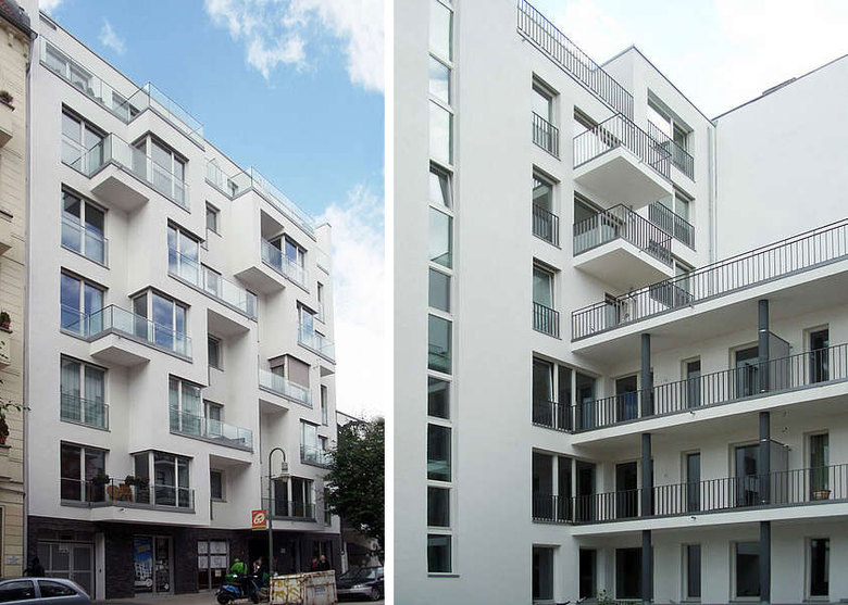 Das Wohn- und Geschäftshaus in der Lychener Straße 53 besticht durch seine ungewöhnlich strukturierte Fassade. Die Balkone und Erker der einzelnen Eigentumswohnungen verspringen und winden sich vertikal über die Straßenfassade.