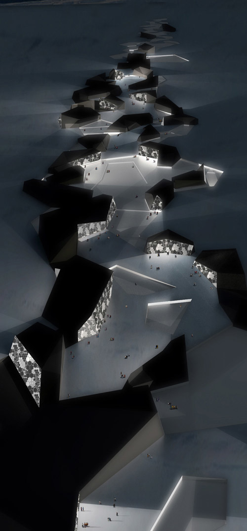 The Bering Strait Project aims at making the Bering Strait a place where the east and the west hemisphere are connected, (both physically and culturally ). The design proposal uses an immersed tube tunnel connection through the Bering Strait. Sections of excavated underground tunnel are positioned on both mainland entries of the tunnel, as well as under the Diomede Islands. The Peace Park can be considered as an independent island, where today changes into tomorrow. The community is divided on the two Diomede Islands and consists of different types of housing as well as various public facilities. In addition, a series of light towers were developed to complement the connective program of the project as well as ventilate the tunnel.