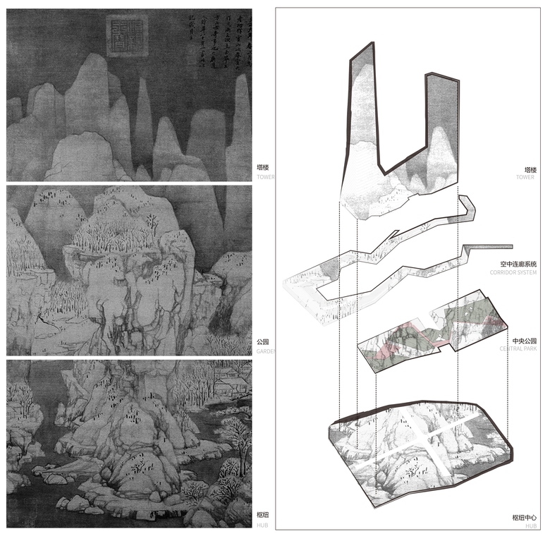 When we started to think about how to create a new world-class landmark city, a 600-year-old Chinese landscape painting became the original source of inspiration. The landscape painting depicts high mountains, dramatic rock peaks and concisely portrays the spirit of Chinese traditional culture. Combined with modern design concepts, we used the spirit of the Chinese landscape painting as the principle behind our design of space and architectural form.