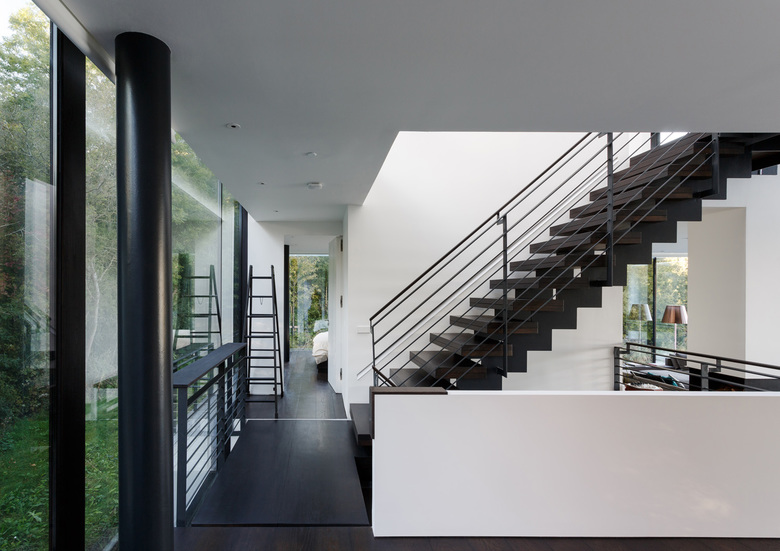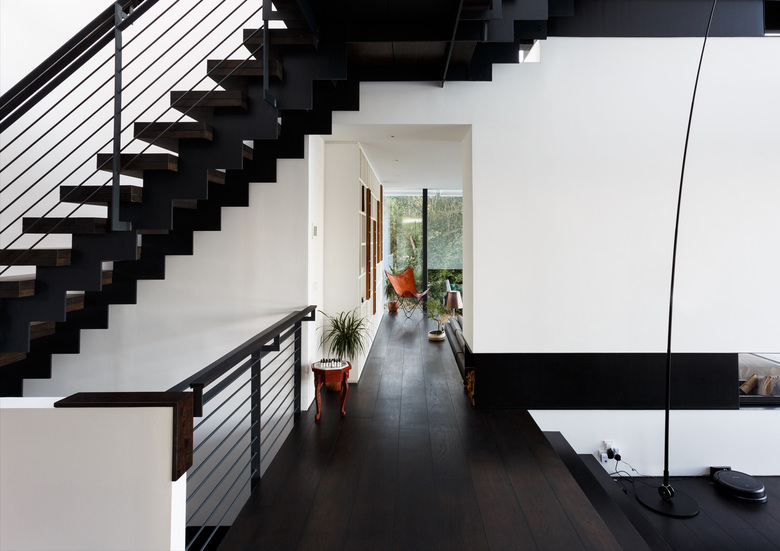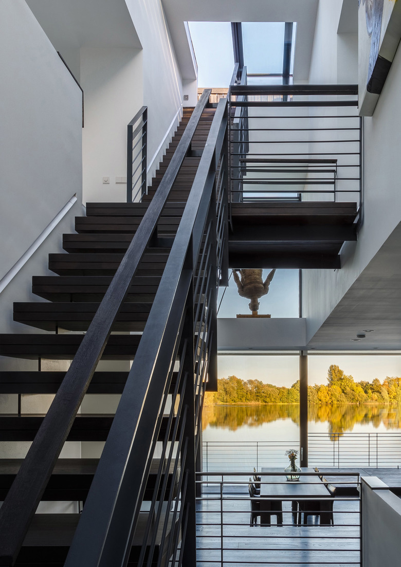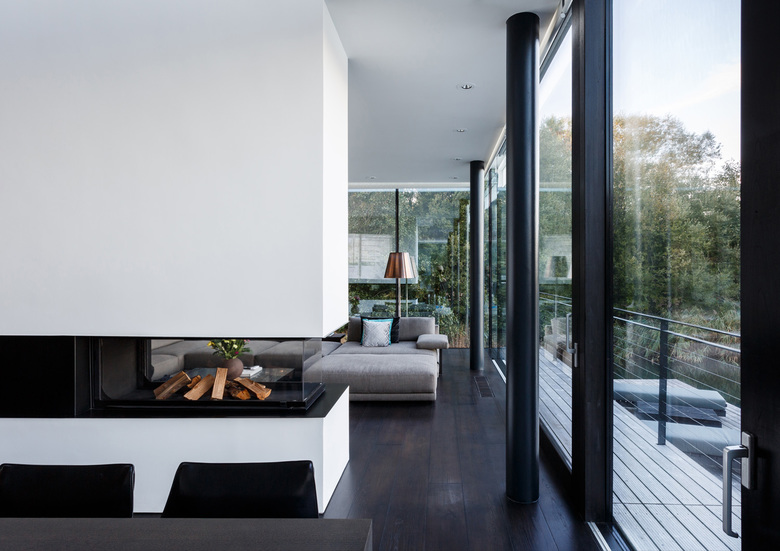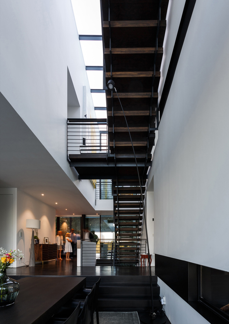 Interior elements such as the fireplace and storage cupboards, divide the house into different places, creating more intimate and private areas within the large transparent volume. In the heart of the house, a full-height void connects all levels and creates another series of diagonal and vertical sight lines.