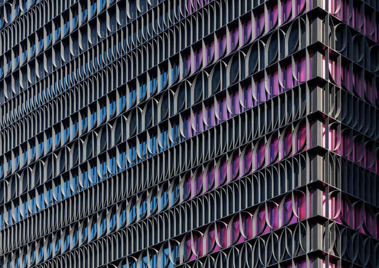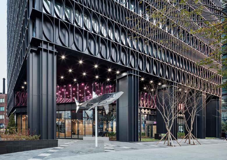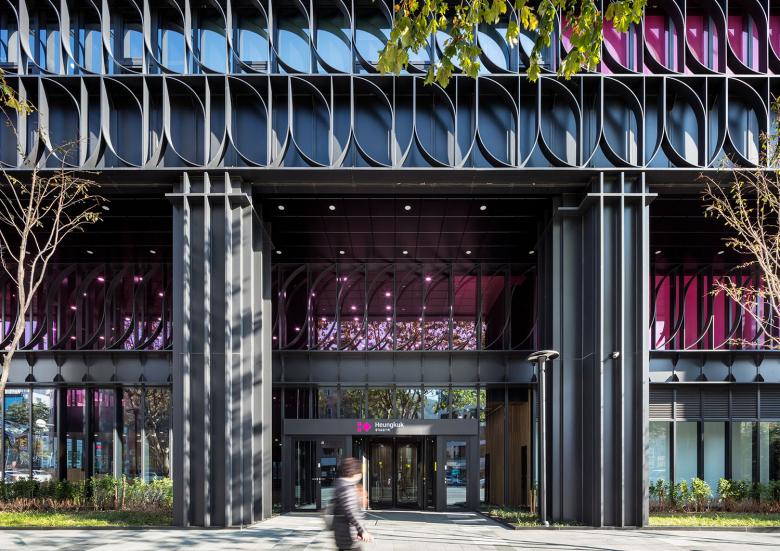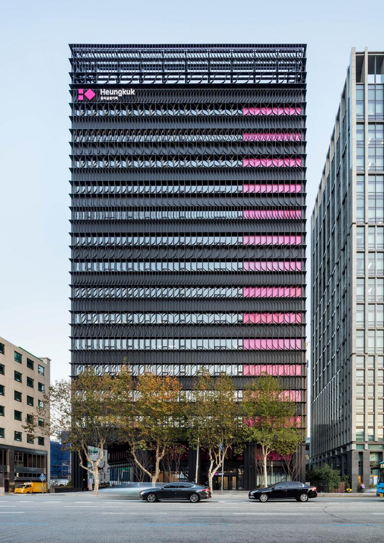 Located in South Korea’s second most populous city Busan, the Heungkuk Tower serves as an office building and sits adjacent to the coastline and close to the city’s high speed rail network. The building’s distinguishing feature is its stark black and fuchsia facade of various linear patterns. The role of the frame extends beyond decoration, continuously creating different atmospheres, filtering incoming light and making shadows across the interior spaces.