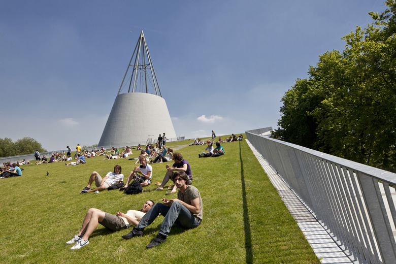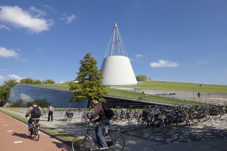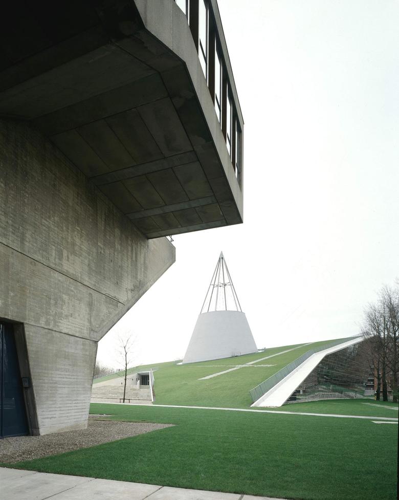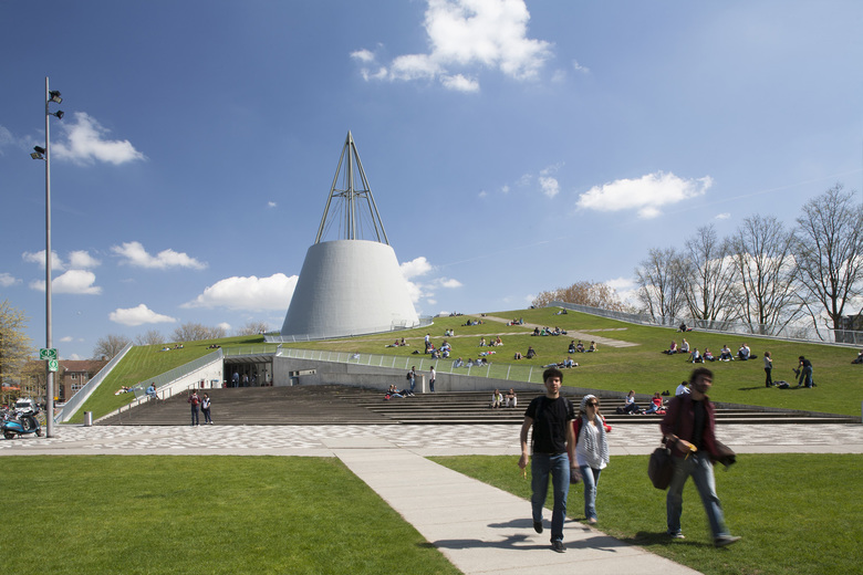 A vast lawn opposite the Brutalist concrete auditorium is tilted at one point; the library slides into the resulting space underneath. A cone, the symbol of technical engineering, pierces the lawn and library, attaching them like a pushpin. Landscape, library and auditorium form a new unity becoming the preferred meeting place on the TU Delft international campus.Upon entering, visitors are drawn to the impressive wall of books that hangs in front of an expansive deep blue background. The columns in the central space not only support the structure but also provide heating and ventilation, and illuminate the continuous metal ceiling that flows across all spaces.