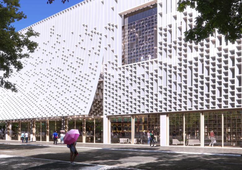The facade takes inspiration from the former modernist design of Hotel Estoril by filtering the light and creating a controlled indoor climate. An intriguing play of light and shadow is projected onto the floor and walls of the library. The continuous ‘L’ shape that defines the library volume and its uniform facade helps to redefine the square.The façade pattern acts as an extension of the bookshelves, from the inside out, from stack to protective shell. The uniform skin wraps the library volume and opens up like a book page to the main entrance facing the Tap Seac square. This welcoming gesture is an essential part of the relationship between library and square.