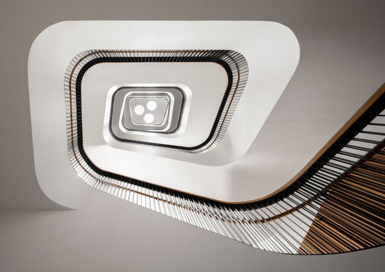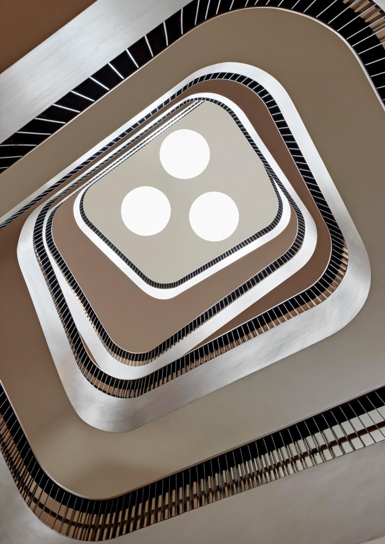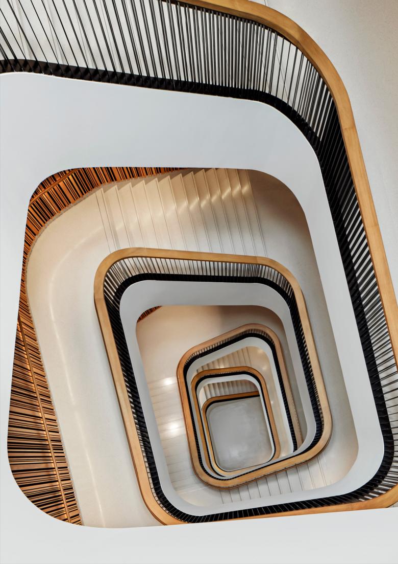 The main G Street entrance leads into the Great Hall, the lobby. The intervention brings warmth and better acoustics to the lobby, and boosts the library’s social dimension from the moment you enter. A new café is partitioned by glass from the Great Hall, and extends to an outside area on the library’s north-east corner. Brick walls have been cut back so that it is open to the sidewalk, connecting the library with the city.Mecanoo has introduced two new wood-lined staircases characterized by their sculptural fluidity. Stairs are wide, terrazzo surfaced and curve up around a middle void from the lower ground floor to a new fifth floor, where natural light falls through circular skylights. The staircases exemplify Mecanoo’s organic styling, bring a soft, sweeping rhythm to vertical circulation, and they act as social connectors.