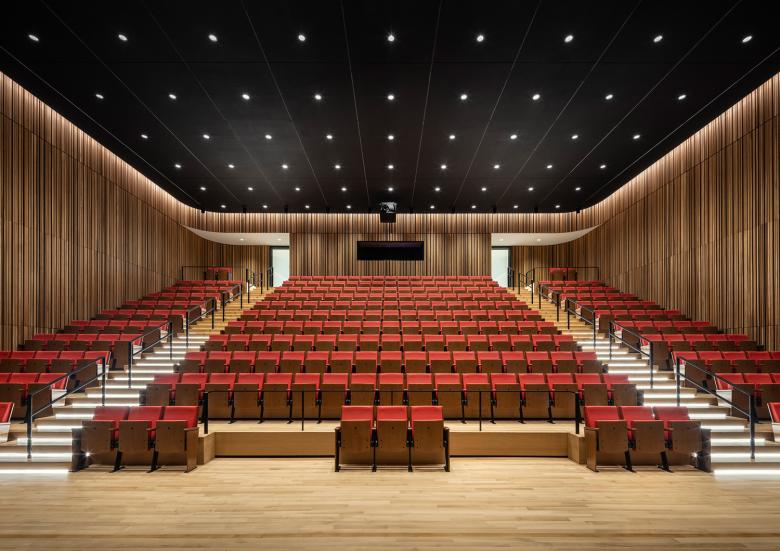 On the third floor, the highlight is the Grand Reading Room. Previously just one floor high, removal of a ceiling now gives it double height, visually connecting into the fourth floor reading room above it. The fourth floor now features a major 291-capacity auditorium. This double-height event space has warm wood-lined walls which curve around the corners, and banked seating which rises into an entirely new fifth floor.