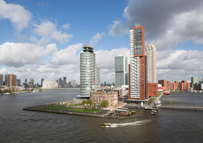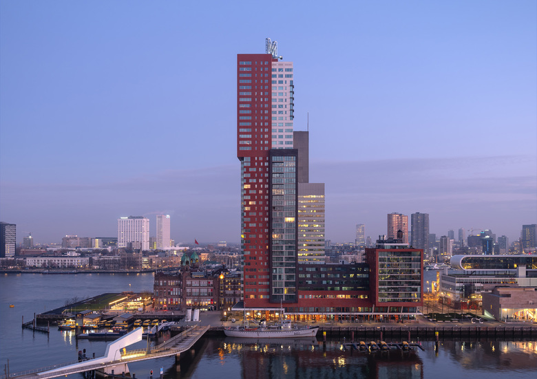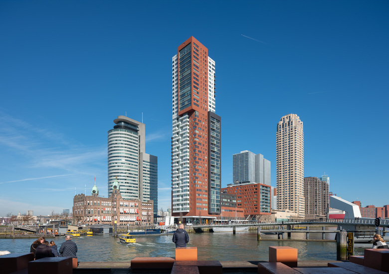 The starting point of the design was the ‘Holland-America feeling’ of the pier. The building is a composition of interlocking volumes, a section of which cantilevers over the quayside. Situated in the lower section of the building, restaurants and offices enhance the vibrant urban atmosphere, while the tower section references 1930s skyscrapers in New York, Boston and Chicago.Besides apartments, restaurants and offices, the building program includes guest suites, a swimming pool, gym and sauna. The structure is essentially hybrid, featuring an American-style steel structure on the lower two floors, a ninety-metre-tall typically Dutch concrete structure in the middle section, and a steel-structure top.