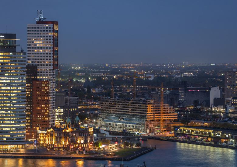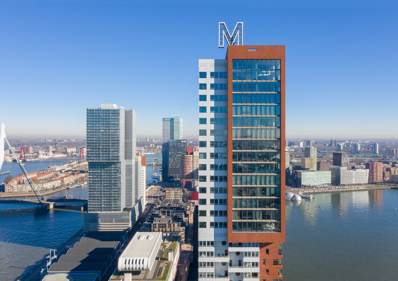 The name Montevideo recalls the tradition of warehouses that once stood here with exotic names such as New Orleans, Santos, Baltimore and Havana. The letter ‘M’ atop the building is an eight-metre-high weather vane. It stands for Rotterdam’s maritime tradition, the River Maas and, of course, the building’s name.