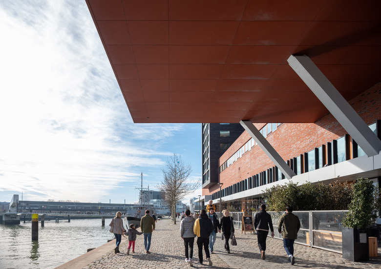 The Wilhelmina Pier is located next to a disused dock in Rotterdam, an area now home to residential and office towers. The pier was once a bridge to the new world, a place where ocean liners departed for America. In 1999, Mecanoo devised an urban concept for the south quay, which is mostly designated for residential development.