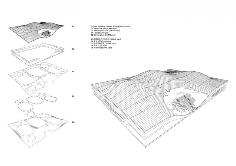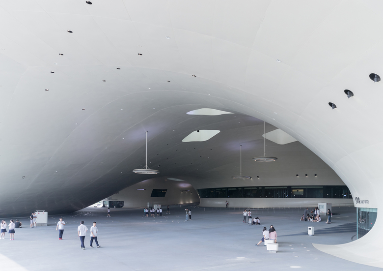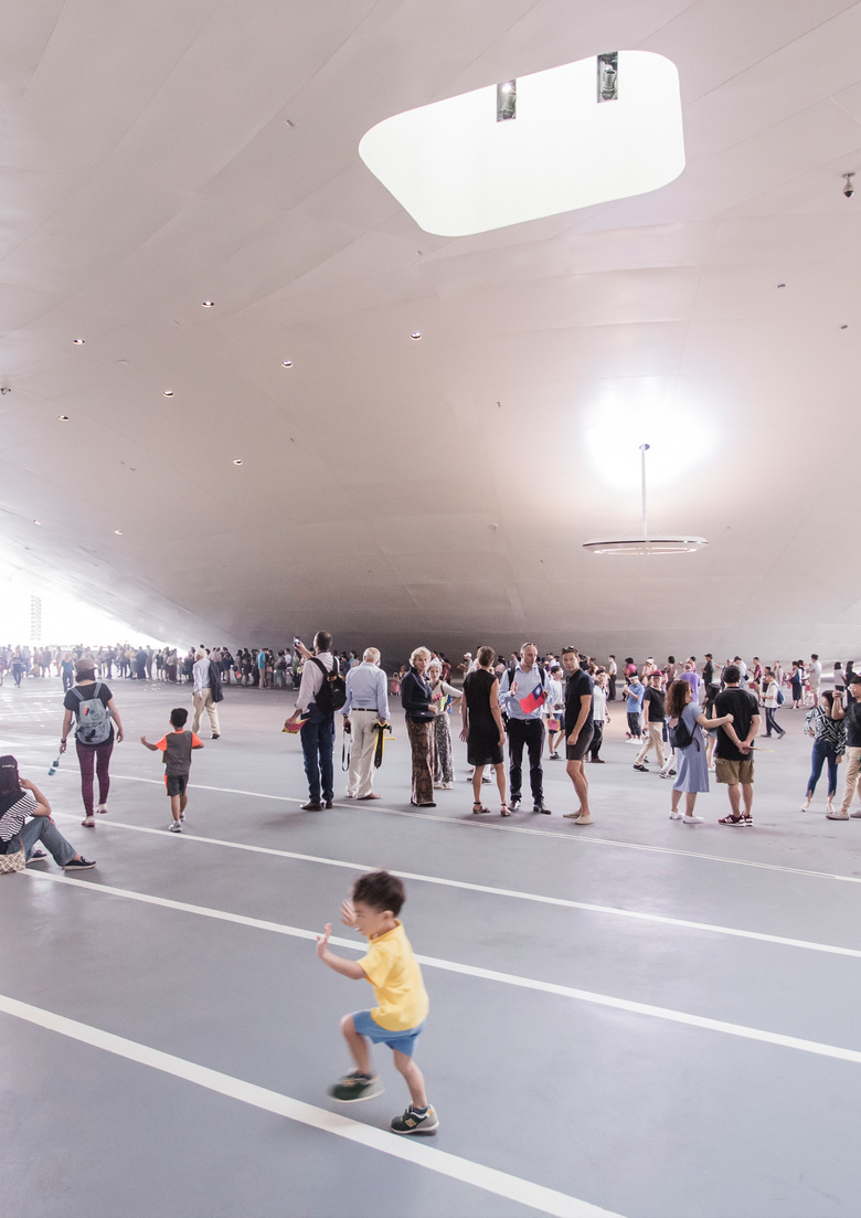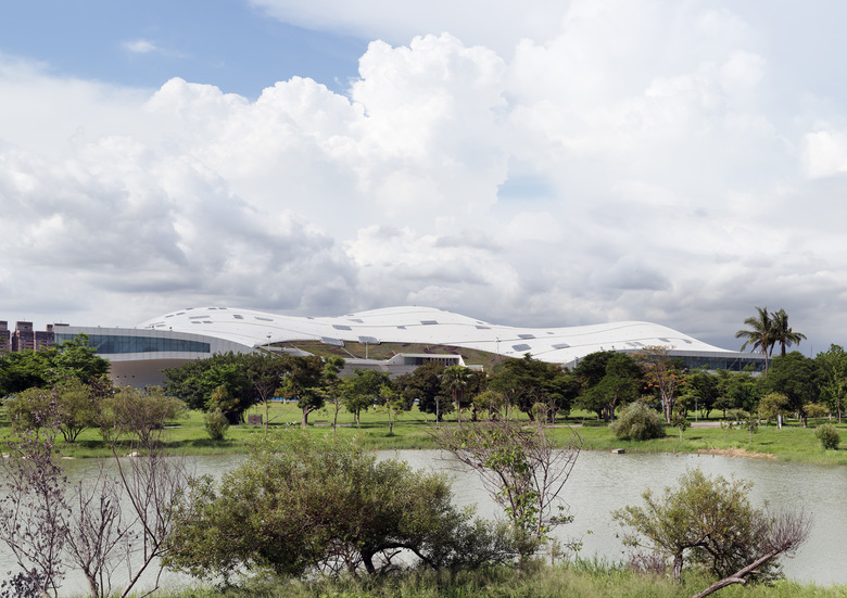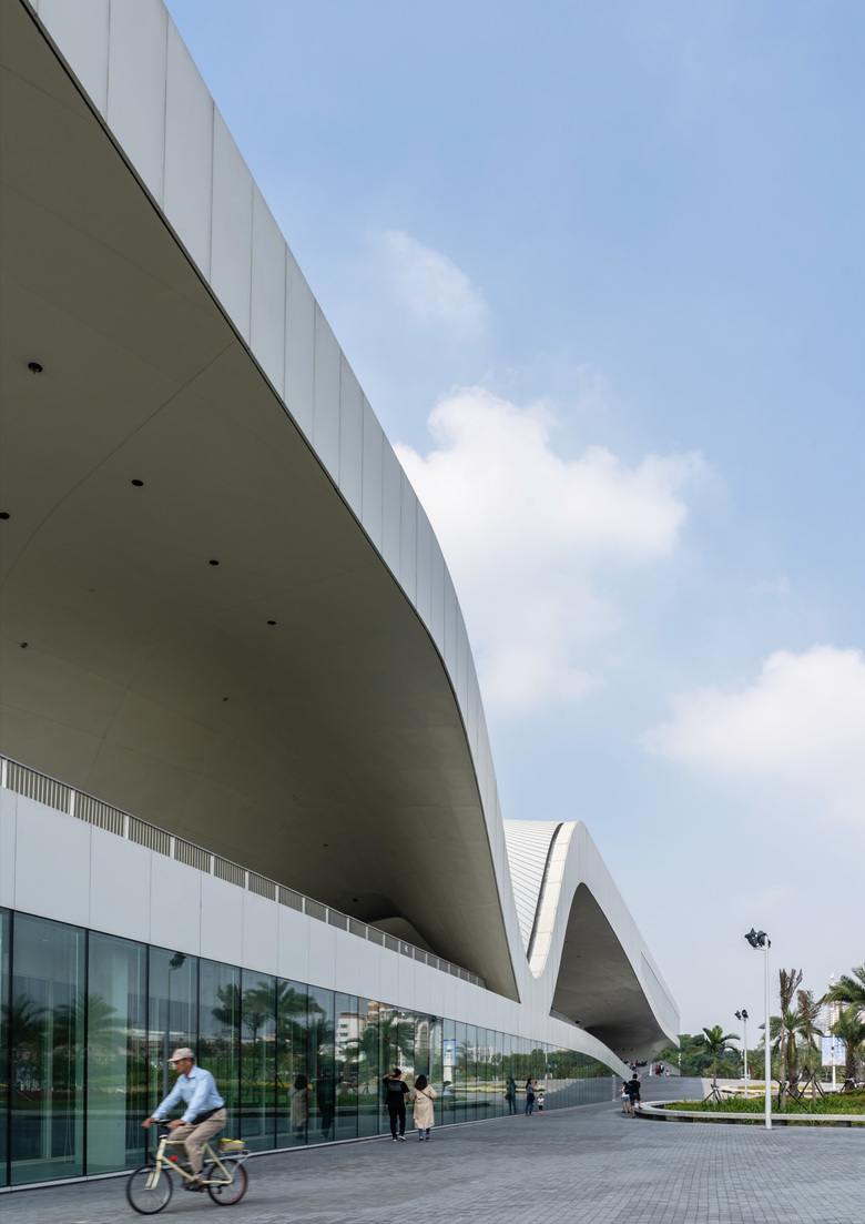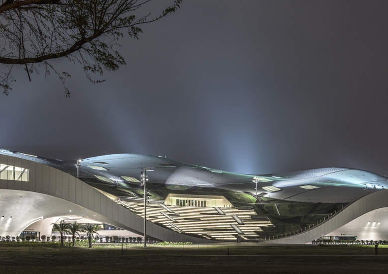Inspired by the local Banyan trees with their iconic crowns, the vast, undulating structure is composed of a skin and roof, and connects an extensive range of functions. The curved steel structure was built in cooperation between a local and a Dutch shipbuilder. Underneath this roof is Banyan Plaza, a generous, sheltered public space. Residents can wander through here day and night, practice Tai Chi or stage street performances along walkways and in informal spaces.An open-air theatre nestles on the roof where the structure curves to the ground, with the surrounding park forming the stage. Designed with the subtropical climate in mind, the open structure allows the wind to blow freely through Banyan Plaza. The seamless flow between interior and exterior creates opportunities for crossovers between formal and informal performances.