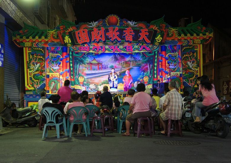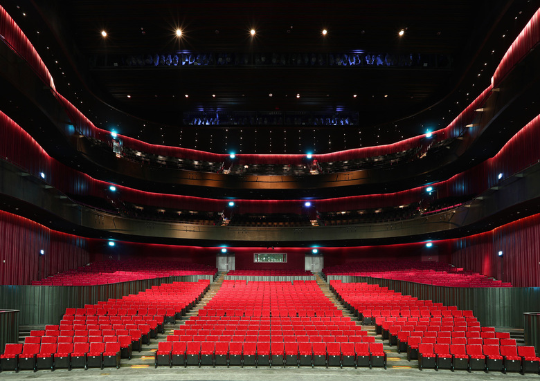The 2260-seat Lyric Theatre (also known as the Opera House) is arranged in the form of a horseshoe with three circled balconies. The seating is upholstered in a mixture of red and purple fabrics with a pattern of Taiwanese flowers, contrasting with the darker walls. This theatre is not only suitable for Western opera, with an orchestra of over seventy musicians, but can also be acoustically adapted to accommodate Chinese opera by manoeuvring a suspended acoustic canopy.