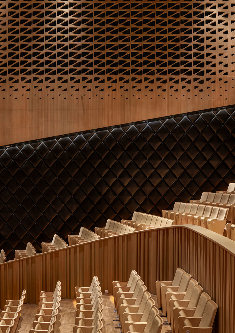 The 470-seat Recital Hall has the most intimate atmosphere of the four. With its asymmetrical composition and seating across two levels, it is designed for chamber music and recital performances. The seats have the same golden fabric as the Concert Hall and oak lines the walls. The upper part of this hall is enclosed by a circle of sound absorbing curtains, allowing for the reverberation time within the space to be tuned to specific types of performance.