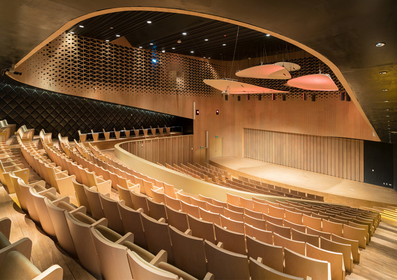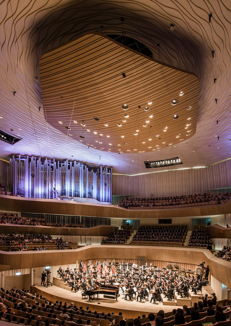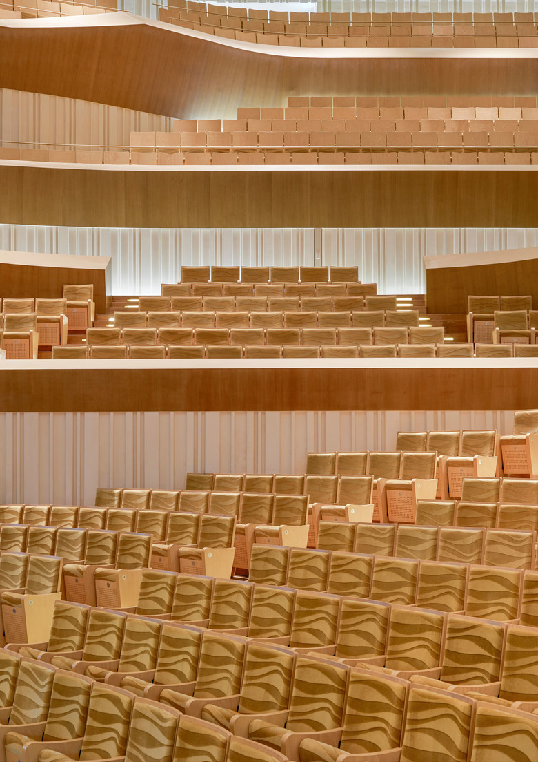 Each of the four performance halls has its own acoustic challenge, and so we collaborate with acoustician Albert Xu. He constructs a 1:10 scale model to test the performance of the most complicated venue: the 2000-seat Concert Hall. Despite its size we want the theatre to have an intimate feel. Wouldn’t it be great if every member of the audience could see the hands of the pianist? We choose the shape of a stepped vineyard with a stage at its centre, so that terraces at different floor heights encircle the podium. With seating on all sides of the stage, the audience is in close proximity to the performance itself. The public enters the oak-lined from the ground floor and spiraling ramps lead them to their golden seats.