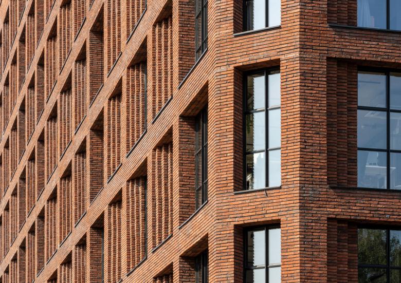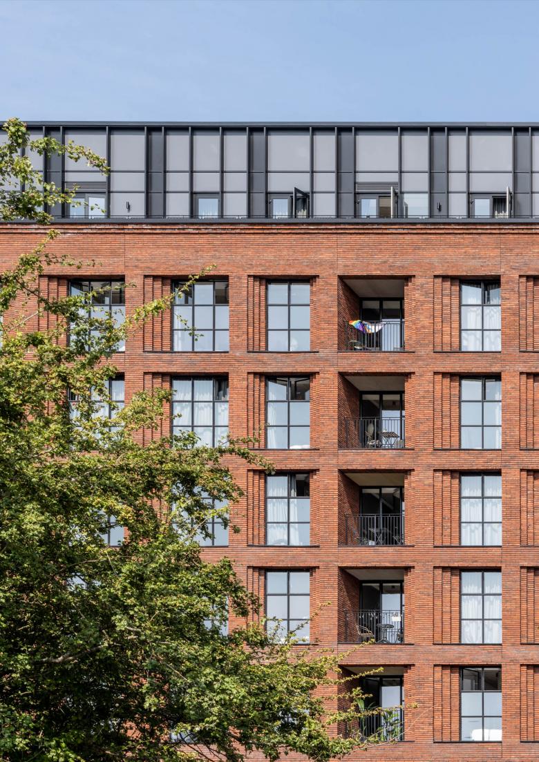 The plinth is designed to activate the street, incorporating entrances and terraces for the commercial spaces on the ground floor. A double-height lobby serves as a focal point for both the commercial and residential entrances, effectively dividing the entire building length while simultaneously enriching the liveliness of the street. The single-storey crown on top has been set back from the building perimeter to allow for terraces on this level. Recognising the importance of adaptability and flexibility resulted in a layout and façade design that were meticulously crafted to accommodate different functions within the building. The grid system was specifically designed to cater for the diverse requirements of both office and residential spaces.