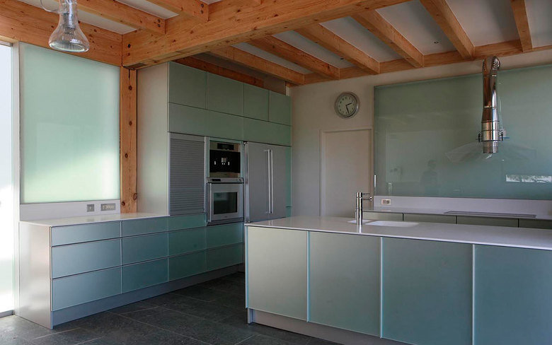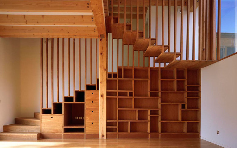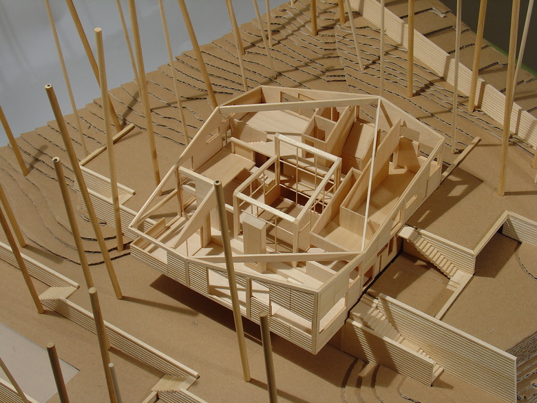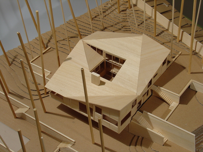 From both inside and out, the roof plane is perceived as a continuous, modulated surface whose inclination follows that of the land. Upon a simple plane a rotated square was inscribed, marking lines about which the roof was then folded. The resultant prismatic geometry is clear and direct. The house appears compact from the outside, yet spacious and lofty from within, with interior views passing through the courtyard and across fine carpentry details where hanging stairs integrate with interior woodwork, creating screens shelves and handrails.