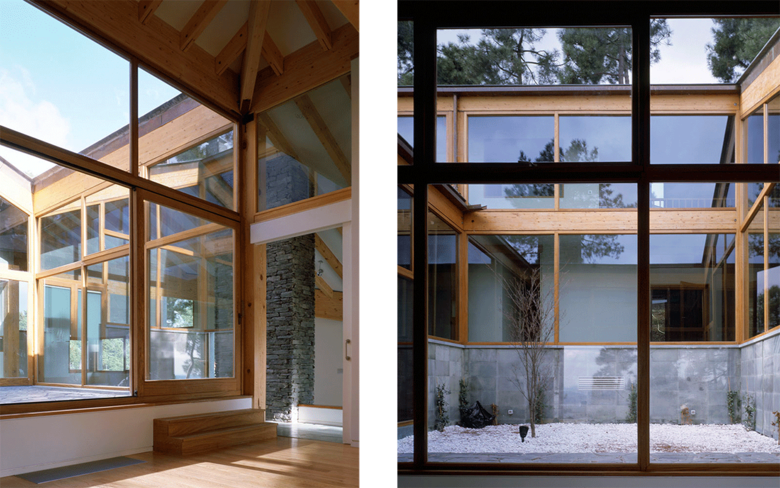 The plan is built on a nine square grid with a glazed interior courtyard. The lower floor is stepped, following the natural grade of the terrain. As a result, each space has an easy and direct relationship with the surrounding landscape, and the terraces to the north and south are natural extensions of the house towards the garden.