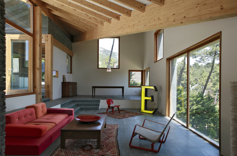 The volume of the house cantilevers over its foundations towards the east, forming a large porch among the pines. The cantilever embodies the idea of the house: that while it is well nested in the landscape it is also oriented towards the monastery. The lightness that is provided by the cantilever helps emphasise the aspiration that characterizes this relationship.