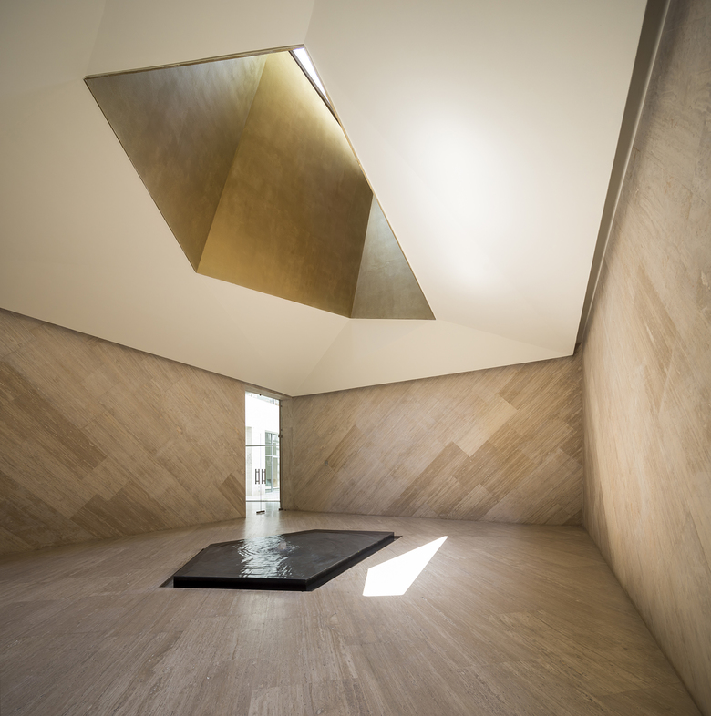 Thanks to the opening up of two large sunken patios, the various spaces on the basement level are flooded with natural light. Around the north patio are the parish’s administrative offices. The patio to the west with the cascading waterfall has to one side classrooms and multifunctional spaces for the community and to the other the ossuaries and a small chapel for funeral rites, spaces that are made more private in their location behind the waterfall. One of the challenges facing us in the design of the basement was the need to connect to the commercial atrium at the lower level; to create a space of transition between atrium and church, we designed a vestibule lit by an open-air, prismatic skylight and, immediately below it, a reflecting pool.