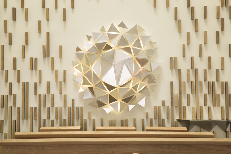 The interior design is fully integrated with the architecture, and the furnishings are by Moneo Brock, from the wood benches to the altar, the choir and the multiple screens, the sliding doors at the entry, the doors to the main sanctuary and the screen that separates the baptistery from the central nave. We also designed elements of a more artistic nature, such as the stained glass windows of the “rose window” (a reinterpretation of the gothic feature, here oriented to the west for maximum effect during the evening Mass), the stained glass at the entry to the ossuaries, and the two sanctuaries, sunbursts made of gold or silver triangles canted to catch light from all angles.
