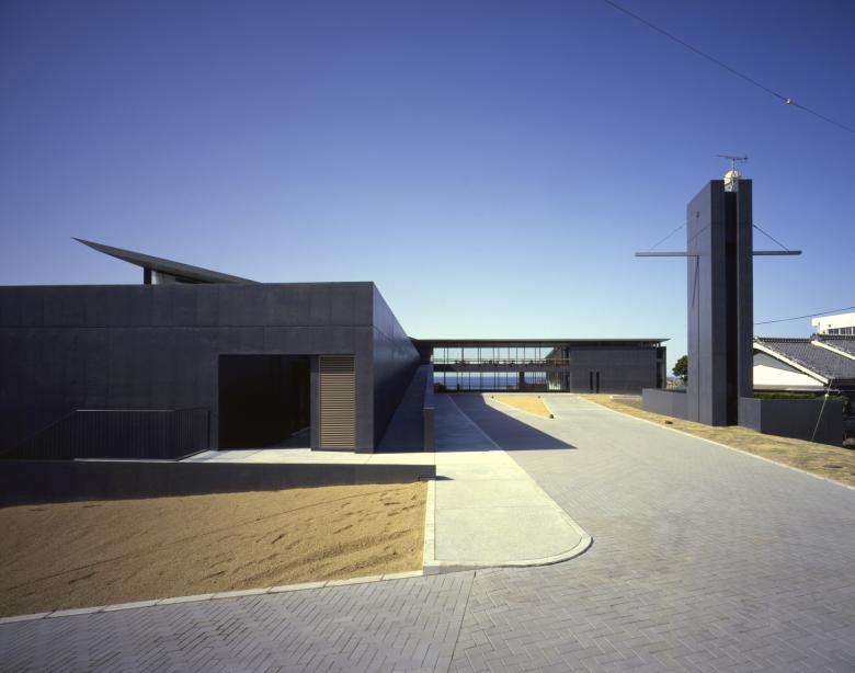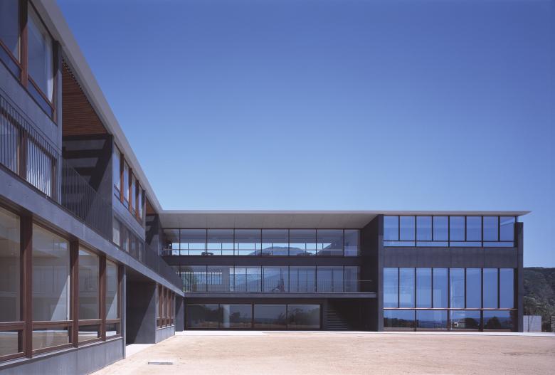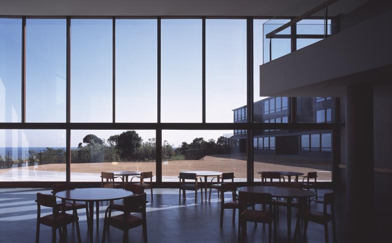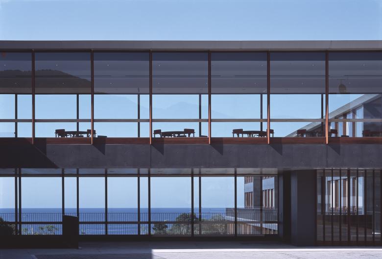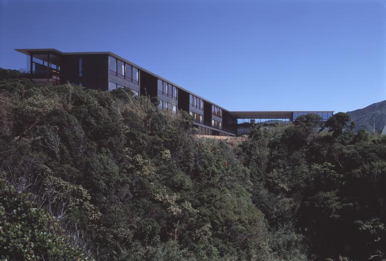 The expanded Z-shaped building has being laid by the axis from the mountains north to the sea south. Along to this Z-shaped architecture, the vast land has being divided into a pair of L-shaped fields; one is the approach to the entrance facing the mountains and the other is the garden covered with lawn facing the ocean. At once transparent space has being created in the middle section of the Z-shaped building, to produce a sense of free spatial flow from the mountain to the ocean throughout glazed windows.