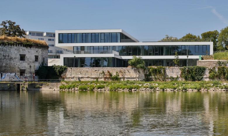 Das Gebäude liegt in exponierter Lage auf einem Plateau über dem öffentlichen Raum, der entlang der Donau verläuft. Geprägt durch eine Bahnlinie, die eine klare Zäsur zum angrenzenden Stadtraum darstellt. Die bestehenden Mauern der Bundesfestung und der Donauturm bilden dabei die städtebaulichen Raumkanten und definieren das Gebäude. So entsteht eine selbstverständliche Struktur zwischen Alt und Neu, zwischen Innen- und Außenraum sowie Ort und Nutzung.