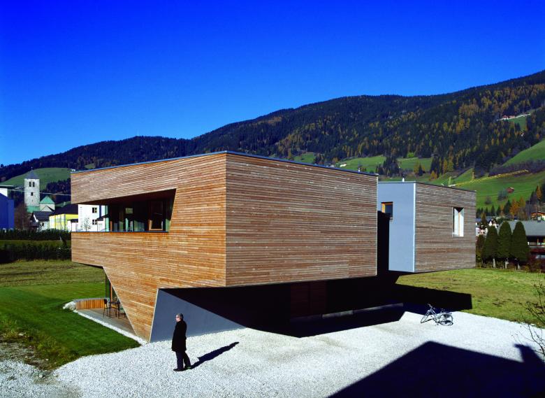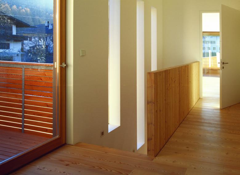 Local materials such are local larch wood are used throughout the design: in the outside as covering façade material , in the inside the wood is used with a white tint. The outside sloped and shaped façade continues in the inside as a built – in sideboard that turns into a series of steps and plinth beneath the internal stairs.