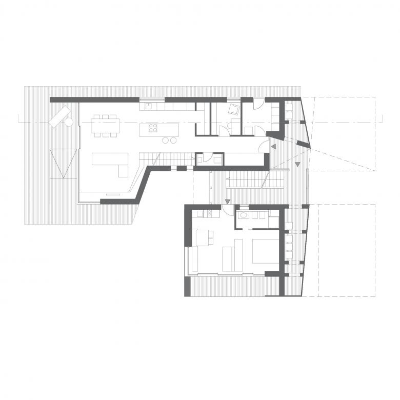Tetris House derived from turning very pragmatic parameters into a spatially engaging concept. Multiple programmatic demands (five self contained units, parking space and exterior areas, potential archeological site) have initiated two volumes: L- shaped in plan and section they are spatially interwoven as to produce a range of in – between spaces.