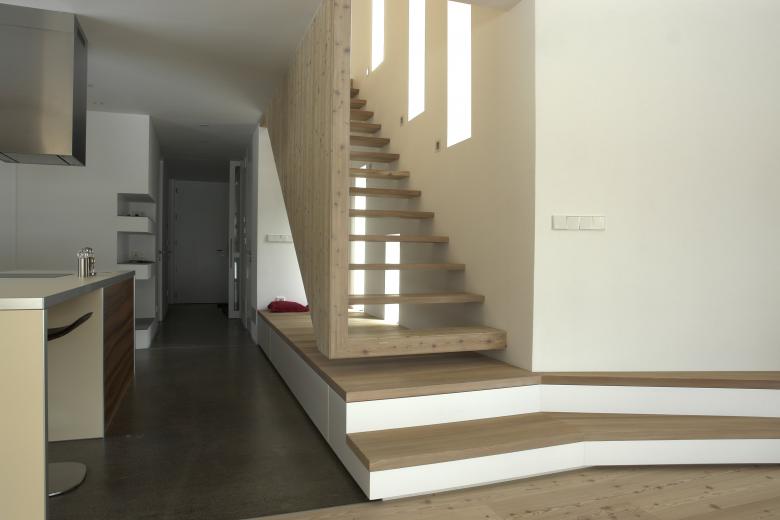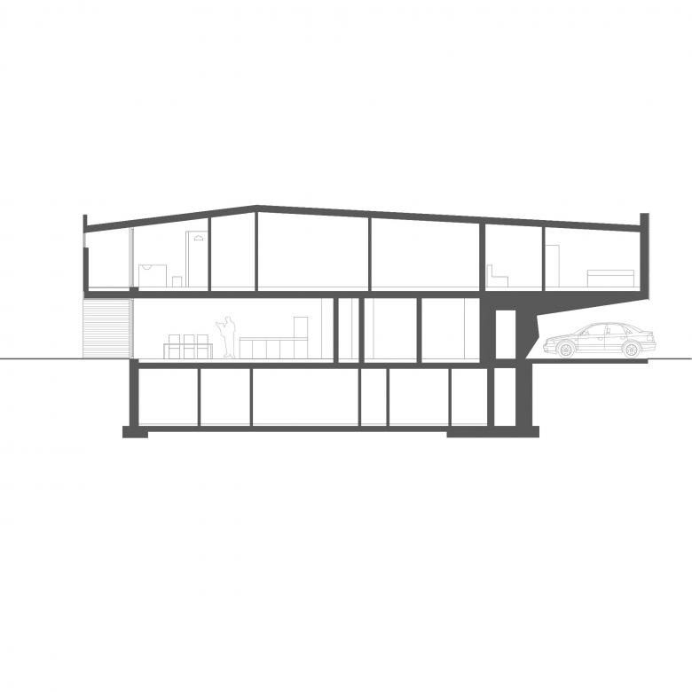 An open staircase between the two parts provides the access for the small units and the common spaces which are put in the underground level. Each volume cantilevers about five meters in order to provide covered parking. The cantiliver whose structural forces are legible in the wall and the ceiling planes is the result of a series of demands and restrictions from the local government on the one hand and the client on the other: