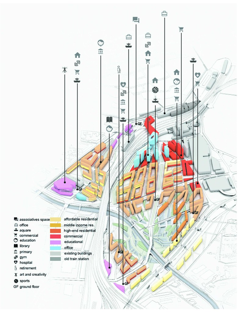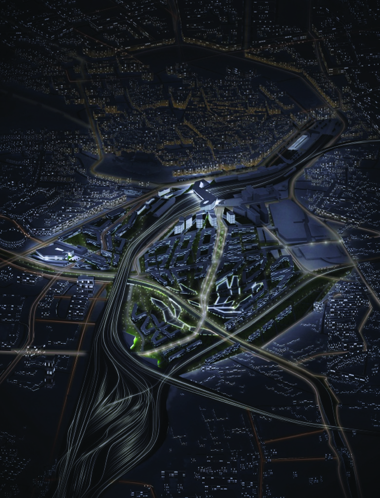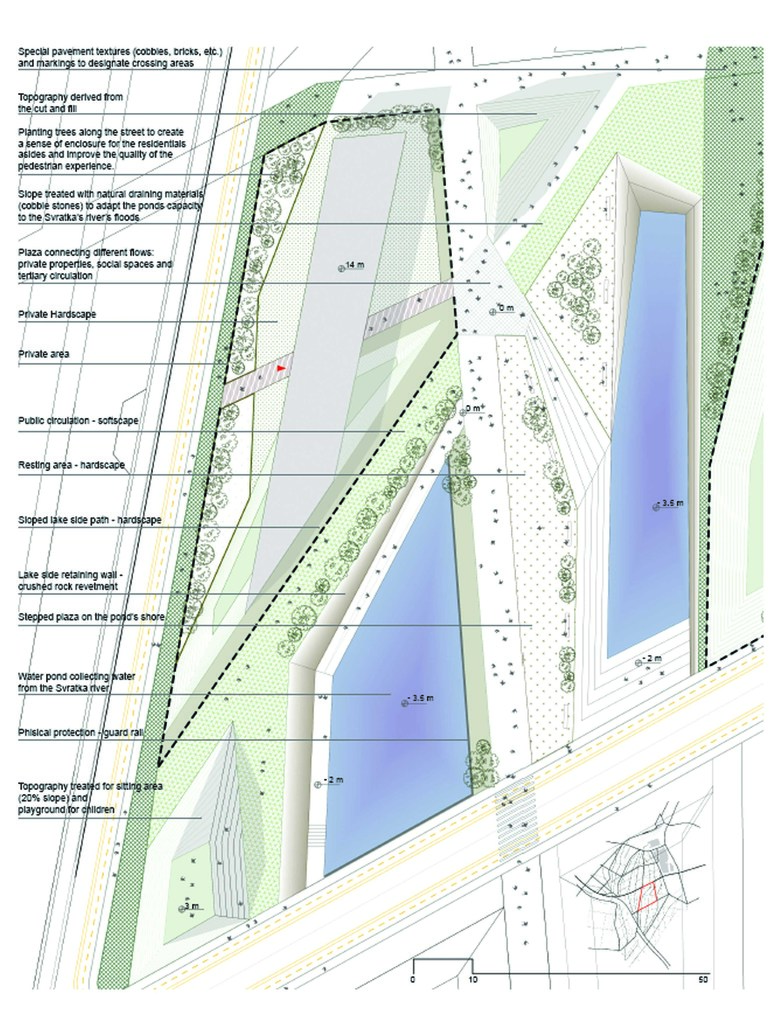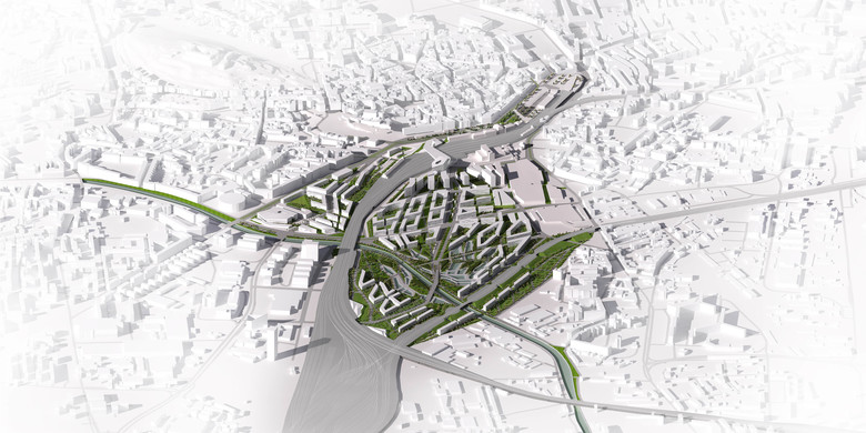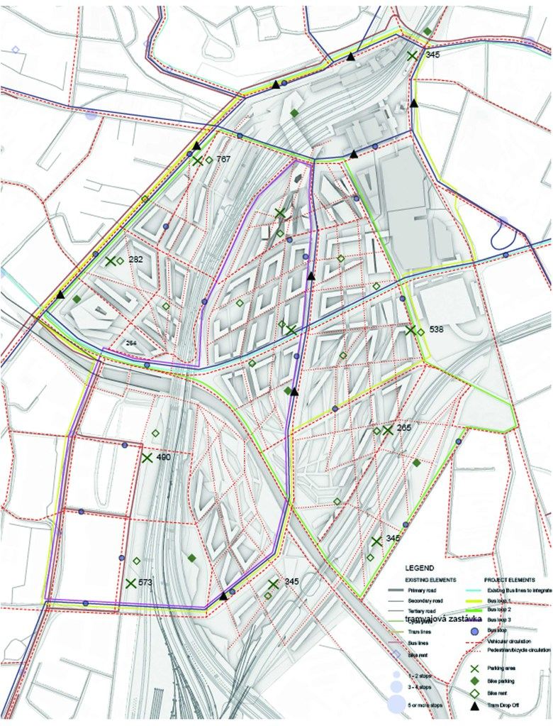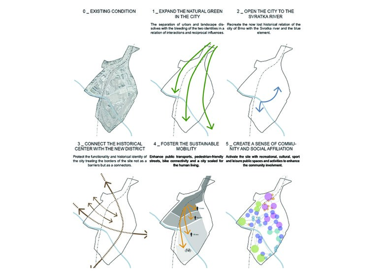 In order to foster the integration of this large and central area into the city of Brno, it was vital to combine connectivity with a vibrant mixed use program. Achieving the same density as the traditional turn of the Century neighborhoods nearby yet giving a decisively green and recreational quality that will also cater to the city as a whole resulted in the concept of pedestrian access with strategically placed array of parking garages.
