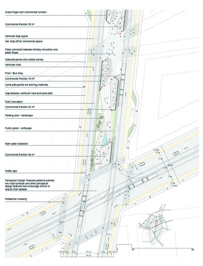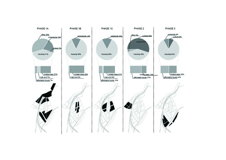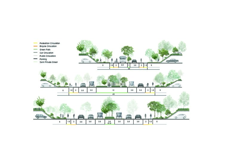 The organization of the new roads enables the area to be served efficiently by public transport so that busses can run in intervals of every few minutes, with walking distances of no more than 200m. These moves harness qualities that foster the appreciation of the area through three phases of implementation. The overall layout was determined by employing mostly the typology of regular linear residential blocks, establishing a differentiation between courtyards and more public linear green spaces. In order to ensure the fully functionality of the different phases, in addition to a balance of both public and provate investments to create a sustainable economical system, we defined for each phase a specific transportation strategy. This have been adapted to the peculiar characteristics of each time, with the intention of both connesting the specific development area or anchors as much as reinforcing or stabilizing the sites completed in the previous phases. Considering the tram system a hardware element in the street system, and consequently more rigid and expensive in the changings,its paths stay the same through all the phases while the bus lines vary.