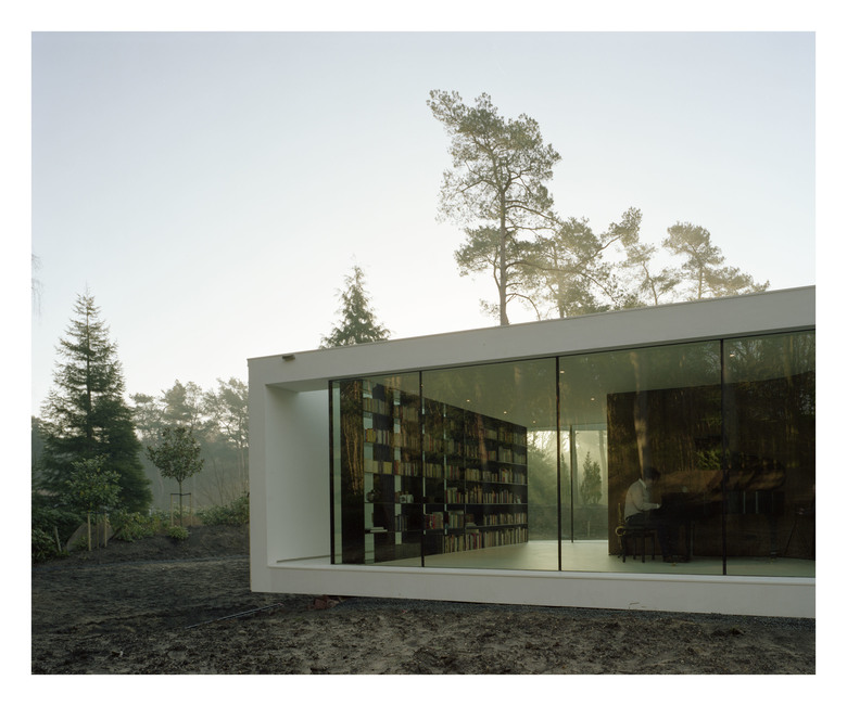 Villa 1 was the first commission for Powerhouse Company, two months after its founding in May 2005. Set in a clearing in a large pine forest, the program of Villa 1 is oriented optimal towards the views on the terrain and the sun. Half of the program is pushed below ground to meet local zoning regulations. This creates a clear dichotomy in the spatial experience of the house – above ground a ‘glass box’ ground floor where all mass is concentrated in furniture elements and below ground a ‘medieval’ basement, where the spaces are carved out of the mass.