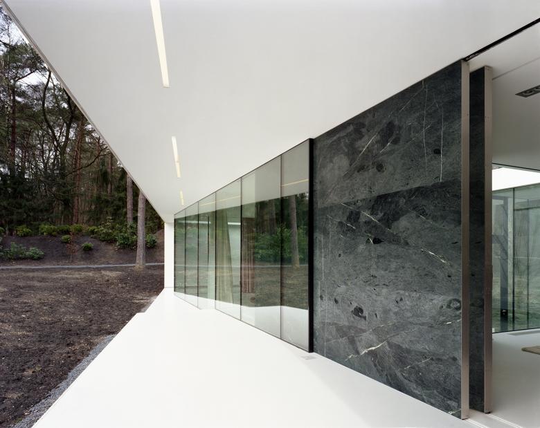 The glass facade is suspended between window frames hidden in the ceiling and floor. There is no vertical structure, only silicone joints to hold the glass. There is one large in the glass facade: a huge green marble sliding wall (a sort of mobilized Mies wall) which opens the intimacy of the living room onto the terrace. Although made of marble, the sliding wall is very light as it is mounted on honeycomb aluminum plates (a Chinese invention called stone-veneer now produced in Texas, USA, with predominantly Middle East stones). The marble sliding wall wraps around a cross-shaped column clad with a black rubber skin: this is what we called the "Miessian Gimp" (a reference to the Gimp character from Pulp Fiction).