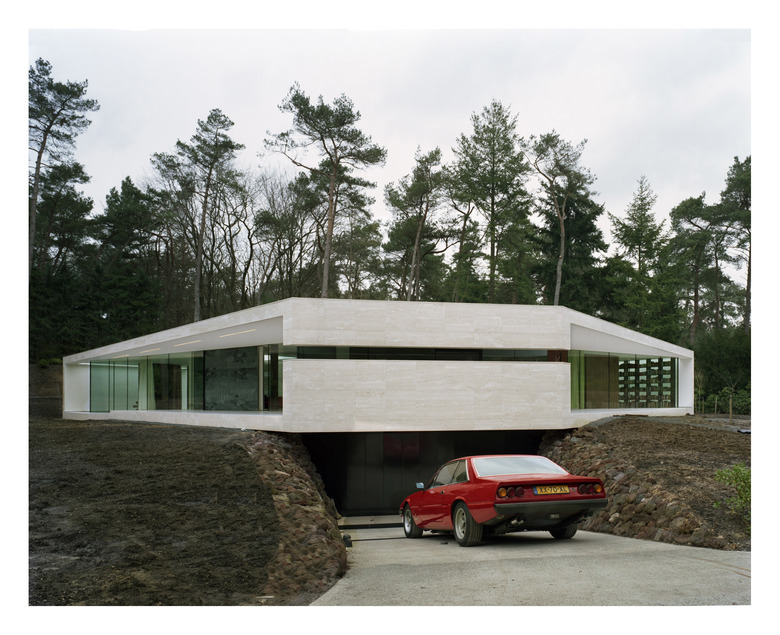 In the basement, the Y-shape creates a similar functional clarity: one wing is for the master bedroom, one for cars and one for storage and guest rooms. A patio provides light for the guest rooms.