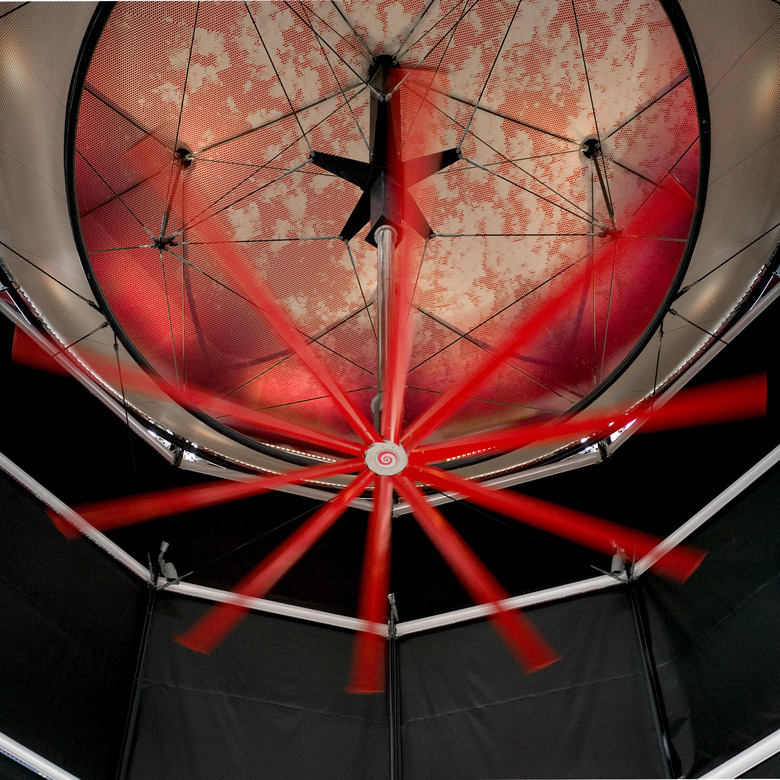 Ventilation inside the Air Tree is provided through a big fan of 7.3 m diameter, suspended by a tensegrity structure in the center of the space, at a height of 11.5 m. Through a telescopic system, the fan can be lowered several meters to be located closer to the people. The exact position and speed at each moment is determined according to the climatic conditions of the environment that are monitored continuously in the surroundings of the structure.