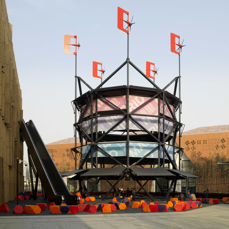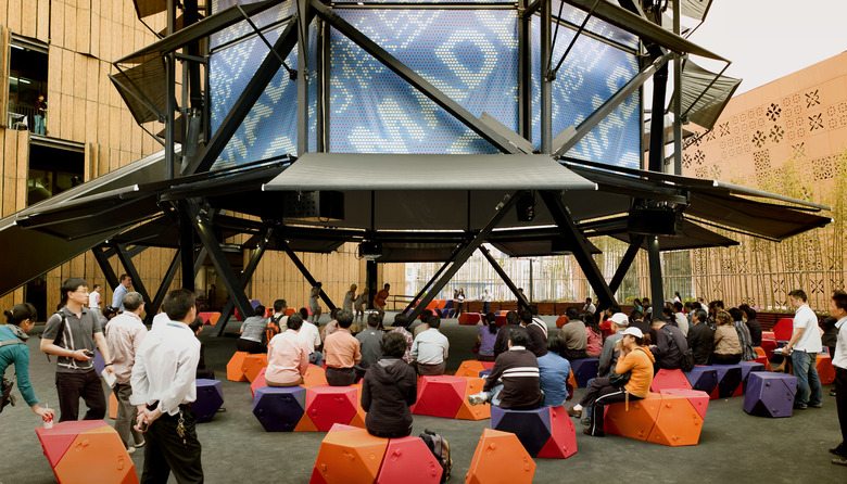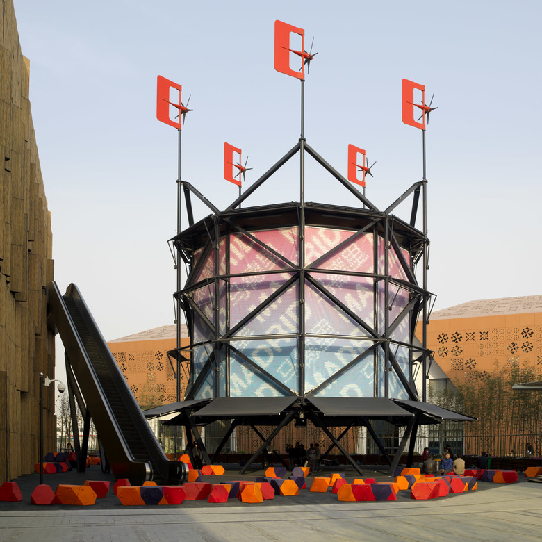 The Air Tree with its different technical layers supports multiple final configurations and a myriad of intermediate positions (opaque, translucent, transparent, bright, interactive, open, etc.). Different textiles for video projections allow an unlimited combination of scenarios adaptable to citizen needs. Its appearance can be transformed over the daily cycle, as well as monthly all through the year. By sensors it is connected in real-time with the climatic conditions of Shanghai, constantly adopting the optimal physical configuration and energy consumption to generate climatic comfort for the citizens.