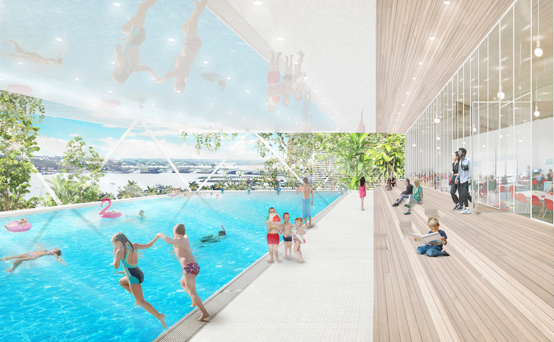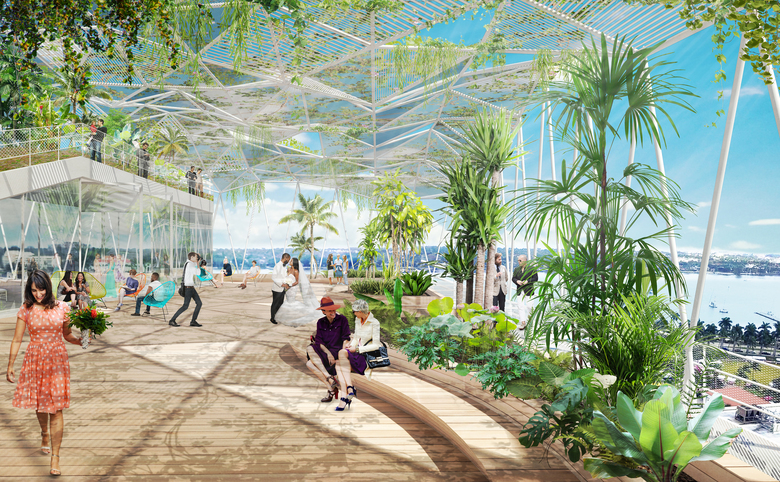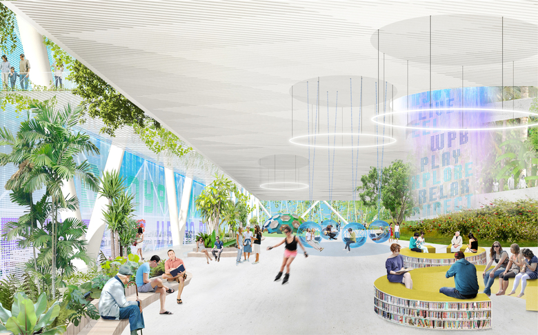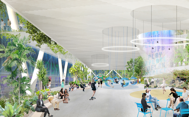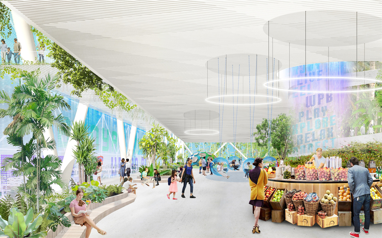 • A covered open-air plaza at an intermediate level for temporary events, including spectacular features such as a digital interactive waterfall or a green courtyard, or local programs as the farmers market.