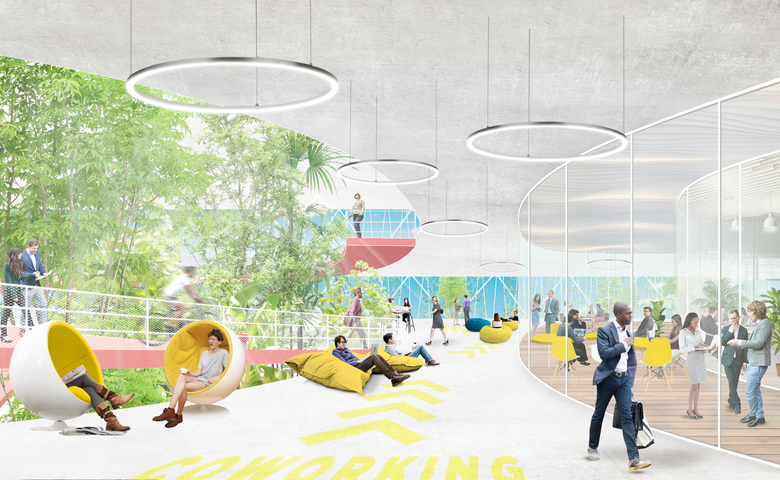 Other uses in the central block of the building are the Business Hub and the YMCA, each of them occupying two levels. Both areas feature the presence of the central green courtyard, an open-air multi-level natural space that gives continuity to the landscaped urban plazas of the building. Moreover, the green courtyard has a relevant passive bioclimatic function as it would help to reduce temperatures by up to 5ºF and regulate ventilation, providing pleasant environmental conditions throughout the year while reducing environmental impact and management and operational costs.