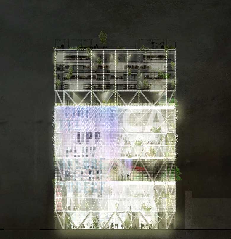The façade acts as one of the main conditioning systems of the building, filtering the direct sunlight and regulating ventilation. It is formed by an array of individual elements that present a responsive behavior, autonomously sensing the climatic conditions and the needs of the building and changing their position. Protected by the external shading, there is a green buffer zone, mainly comprised of a permeable structure holding vegetation and supporting varied activities. This space acts as a second natural filter for light and breeze and contributes to the regulation of the internal temperature through evaporative cooling.
