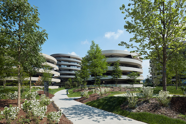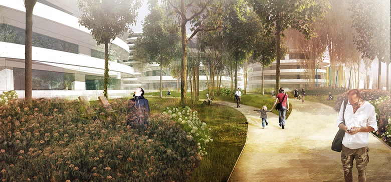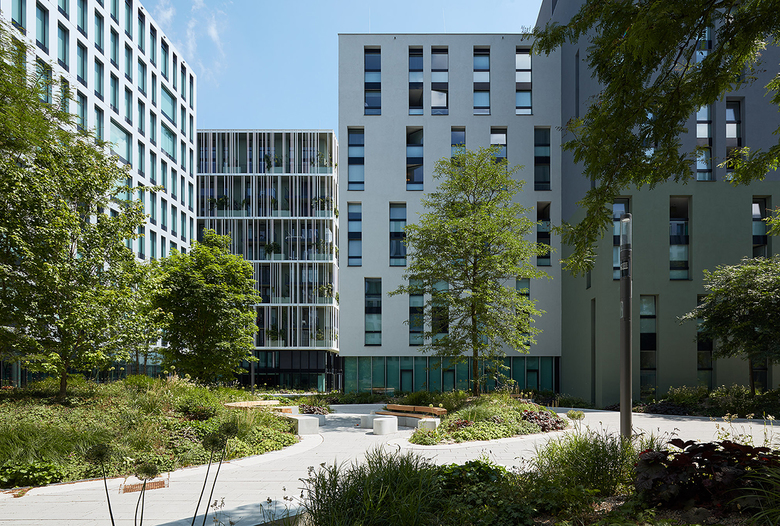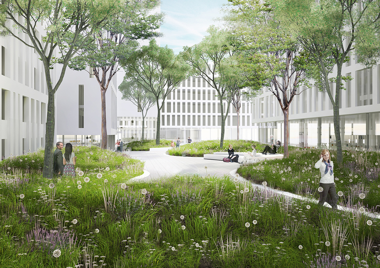 WES entwickelt um einen, die Quartiersmitte betonenden, zentralen Platz eine modellierte Landschaft „Grüner Inseln“. In fast spielerischer Leichtigkeit verdichten sich im fließenden Auf- und Ab sanfter Hügel und Täler unterschiedlichste, attraktive Grün- und Freiräume für Begegnung, Spiel, Entspannung und Infrastruktur zu einem starken atmosphärischen Bild eines zeitgemäßen Konzeptes von Architektur und Landschaft. Auf dem zentralen Platz findet dieses Bild im Wechsel von Entstehen und Verschwinden einer organisch geformten Wasserfläche mit temporärem Fontänenspiel, zugunsten einer frei benutzbaren Platzmitte, seinen besonderen Ausdruck.