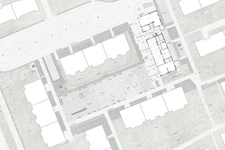 Auf der Westseite, entlang der Dienstleistungs- und Gewerbefläche und dem Eingang zu den Wohnungen, führt ein Weg zum neuen Platz. Das Bistro ist zum Platz hin orientiert und profitiert von einer guten Besonnung und der Neugestaltung des Platzes. Die heute offene und mit Parkplätzen belegte Fläche wird zum Siedlungstreff umfunktioniert. Im Osten liegt ein Mergelplatz mit Bestuhlung und angrenzendem Spielplatz. Dieser Bereich liegt in unmittelbarer Nachbarschaft zu Kita und Bistro und wird von diesen mitbenutzt. Mehrstämmige Heister spenden partiell Schatten, ein Brunnen bietet Erfrischung und Kühlung: Es entsteht ein angenehmes Aufenthaltsklima.
