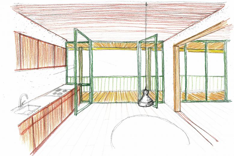 Der Rohbau wird im UG, EG und 1.OG bis auf die Fassadenstützen erhalten. Durch die klare Struktur und die angemessenen Raumhöhen ist der Erhalt dieser Geschosse sinnvoll. Die bestehende Betonstruktur und die neuen Geschosse mit vorfabrizierter Holzkonstruktion bilden eine bereichernde Vielfalt, sowohl in der Grundrissdisposition als auch in der atmosphärischen Wirkung der Wohnungen.