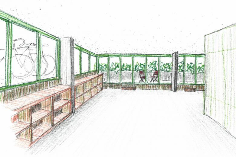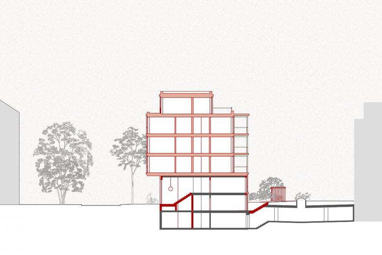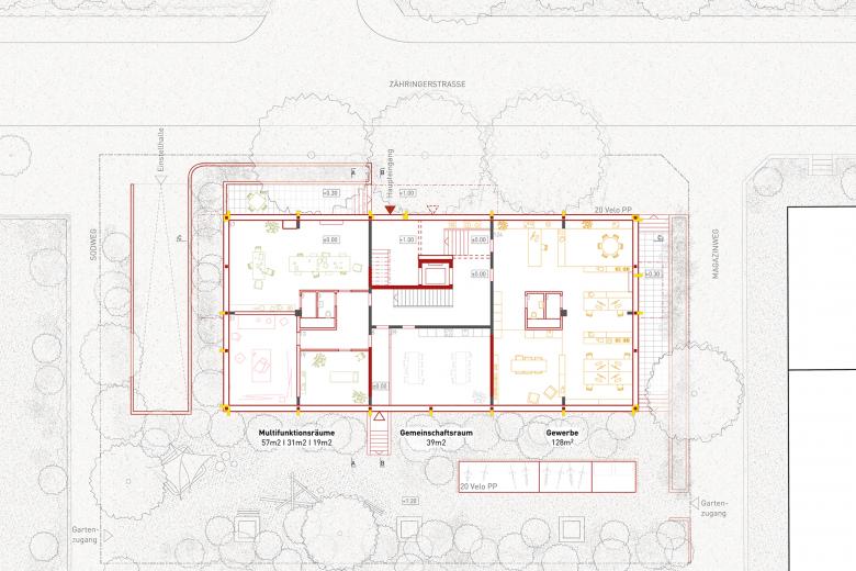 Das Erdgeschoss liegt rund ein Meter unter Strassenniveau. An der Zähringerstrasse und am Magazinweg werden zwei Bereiche mit einem vorgartenähnlichen Grünraum vom Strassenraum abgegrenzt. Diese Bereiche bilden eine geschützte Vorzone zu den im Erdgeschoss gelegenen Arbeitsräumen. Der Hauseingang wird auf Strassenniveau verortet und das öffentliche Leben bis an die Fassade gezogen. Zur Zähringerstrasse entsteht auf zwei Drittel der Fassadenlänge ein Vorplatz, der das Gebäude an der Strasse verankert. Eine neue Verbindung vom Treppenhaus zum Garten und den angrenzenden Gemeinschaftsraum aktivieren den Aussenraum im Südwesten und stärken die Kontakte im Haus.