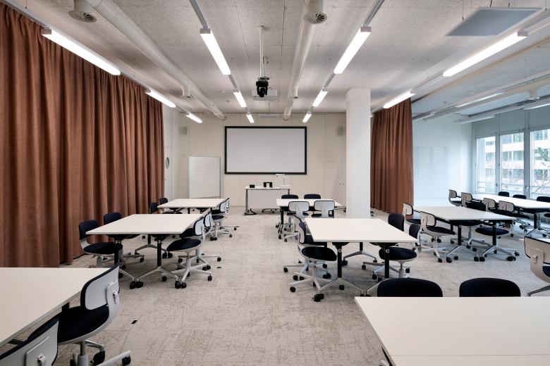 Die Dynamik des didaktischen Konzeptes des Departements Wirtschaft widerspiegelt sich in der neuen Raumstruktur. Es wurden verschieden grosse und flexible Räumlichkeiten geplant, um auf die unterschiedlichen Unterrichtsformen zu reagieren. Im hinteren Bereich sind zwei grosse, durch neue Leichtbauwände begrenzte Seminarräume angeordnet. Den vorderen Bereich bilden wir mit dem Zusammenschluss des Aufenthaltsbereiches und einem weiteren Seminarraum zu einer offenen und flexiblen Situation aus. Mittels Schallschutz-Vorhängen können die Räume zusammengelegt oder abgetrennt werden. An der Ostfassade entlang des Korridors wird die bestehende kleingliedrige Raumstruktur belassen und zu Projekträumen ausgebildet. Der Wunsch nach einer hohen Flexibilität wird durch das Mobiliar eingelöst. Die Rollen an den Stühlen, Tischen und Whiteboards sowie die Klappfunktion an den Tischen ermöglichen ein einfaches Umstellen zu verschiedenen Unterrichtssituationen.