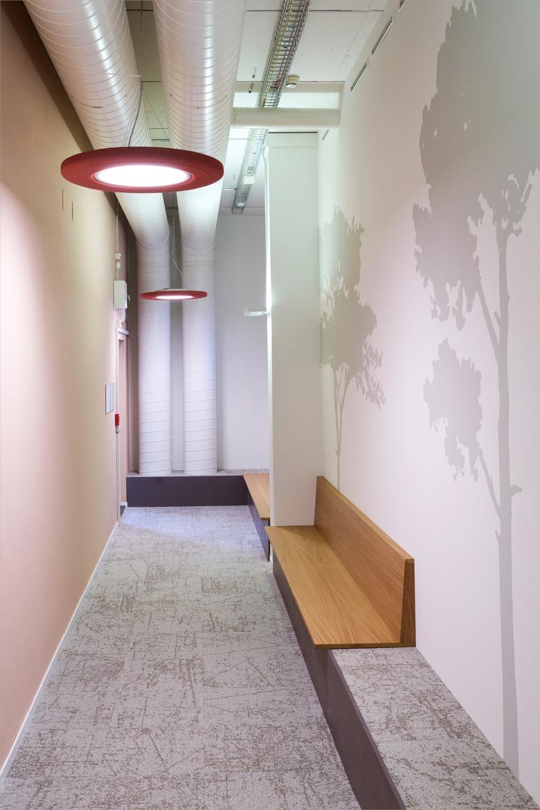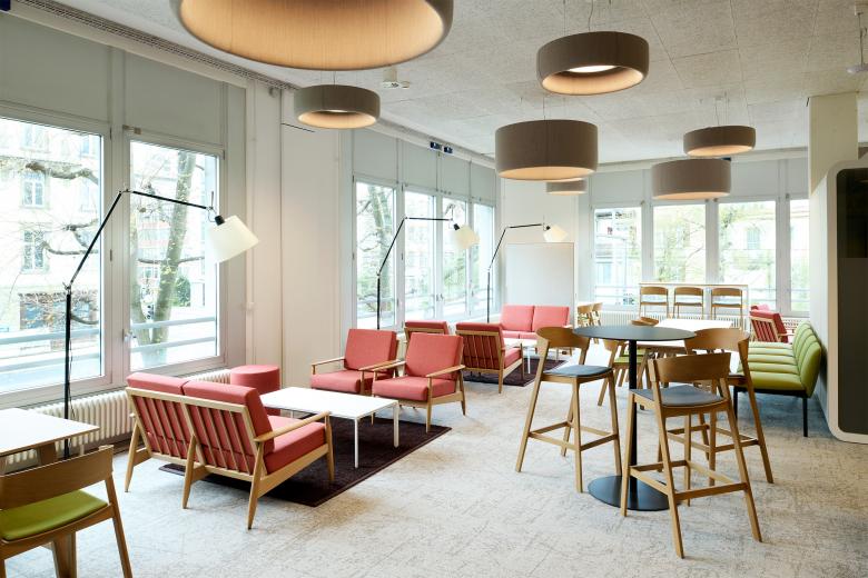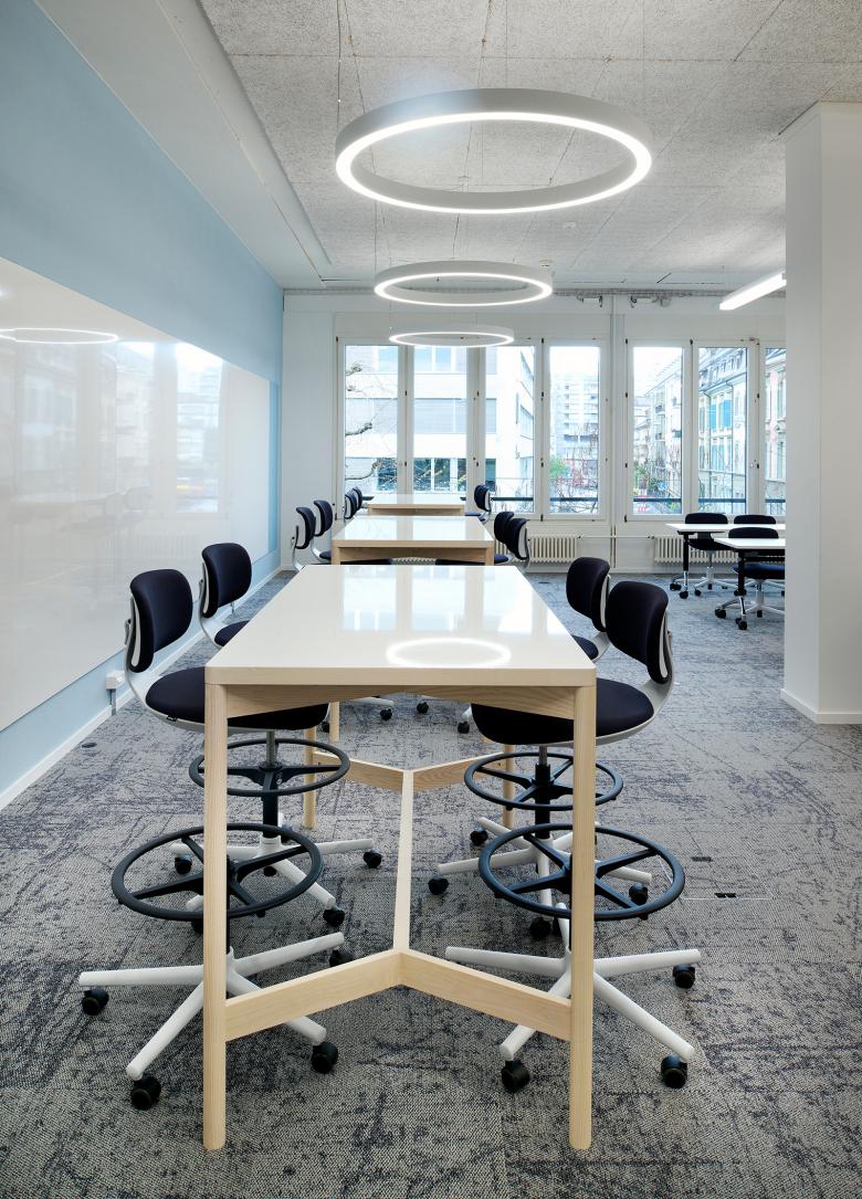 Bereits eingesetztes und bewährtes Mobiliar an bestehenden Standorten der BFH wird in das neue Möblierungskonzept eingearbeitet und mit neuen Elementen ergänzt. Farbliche Akzente brechen das Weiss auf und sorgen gleichzeitig für eine räumliche Orientierung. So sind die Projekträume die grünen, die Seminarräume die blauen Räume. Im Aufenthaltsbereich werden die Farben von allen Räumen aufgegriffen und miteinander kombiniert.