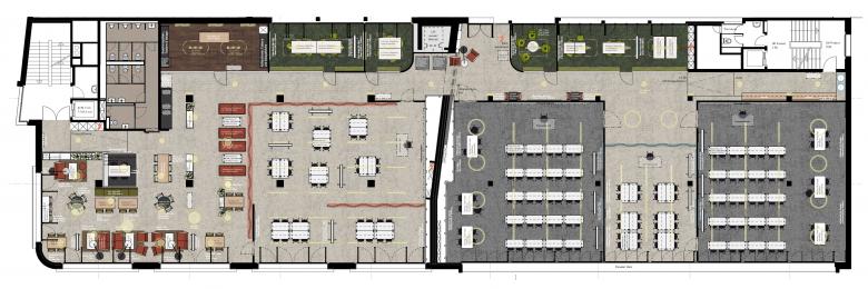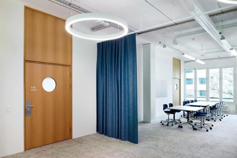 Die Nutzung als Provisorium wird durch die Atmosphäre mit den sichtbaren Elektro- und Lüftungsleitungen und den industriellen Schallschutzelementen unterstrichen. Die Grosszügigkeit im Grundriss und die grossen Raumhöhen sind weiterhin erlebbar. Die bestehenden Einbauten wie Doppelboden und Glasabschlüsse werden ressourcenschonend grösstenteils beibehalten.