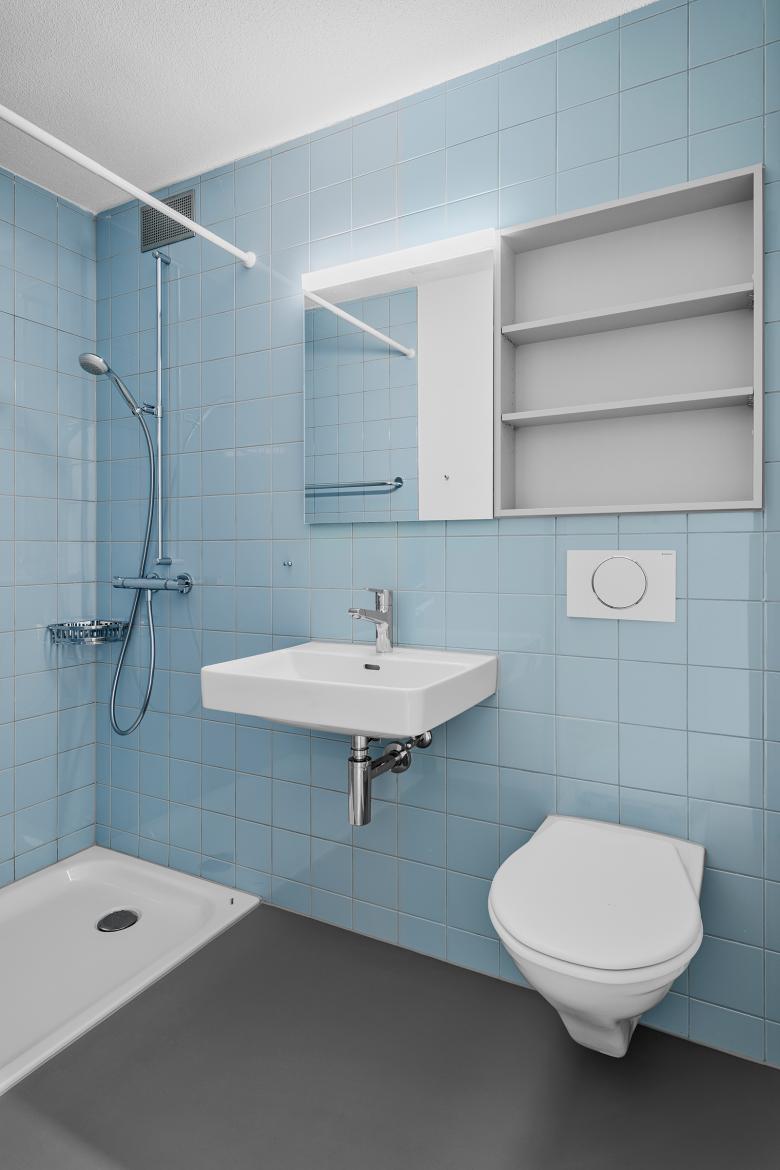 Sie erhielten eine hindernisfreie Dusche und die Liftanlage wird so ersetzt, dass sich die Haltestellen des Lifts neu auf jedem Wohngeschoss befinden. Das sechste Geschoss, welches sich bereits im Bestand an der Nordfassade als Besonderheit abgezeichnet hat und Einzimmerwohnungen beinhaltete, wurde neu eine Cluster-Wohnung mit sechs Einheiten. Die Cluster-Wohnung wird durch ein benachbartes Wohnheim gemietet und bietet Menschen mit unterschiedlichen Handicaps die Chance, selbstständig zu wohnen.