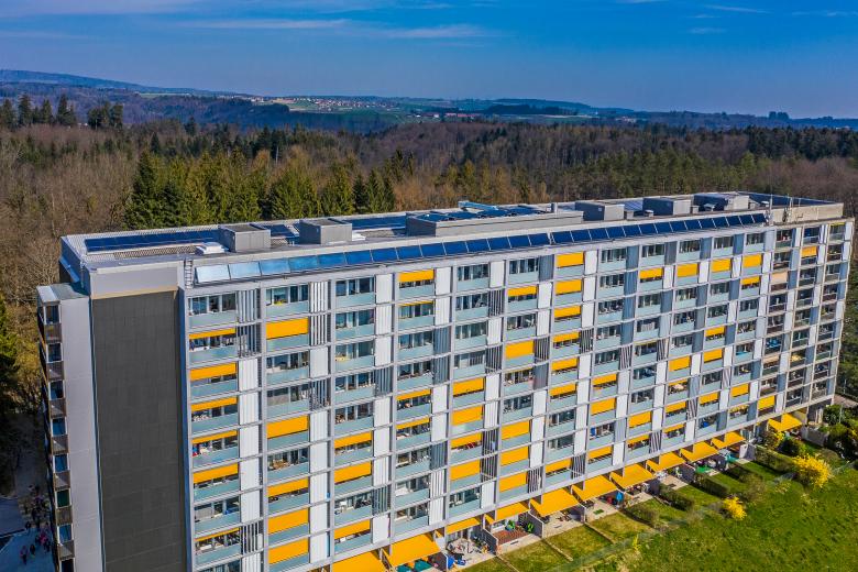 Eine PV-Anlage an der Fassade und eine Solaranlage auf dem Dach produzieren neu Energie und Wärme und verbessern so die Ökobilanz des Hochhauses.
