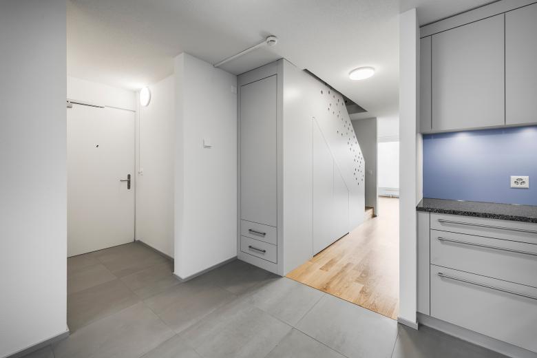Die Grundrissanordnung der Maisonette-Wohnungen wurden leicht verändert: Das Drehen der Erschliessungstreppe ermöglichte einen neuen Eingangsbereich mit Garderobe. Das neu gestaltete Geländer erfüllt die Sicherheitsnormen, versteckt aber auch in seiner Gestaltung auf spielerische Art eine Botschaft…